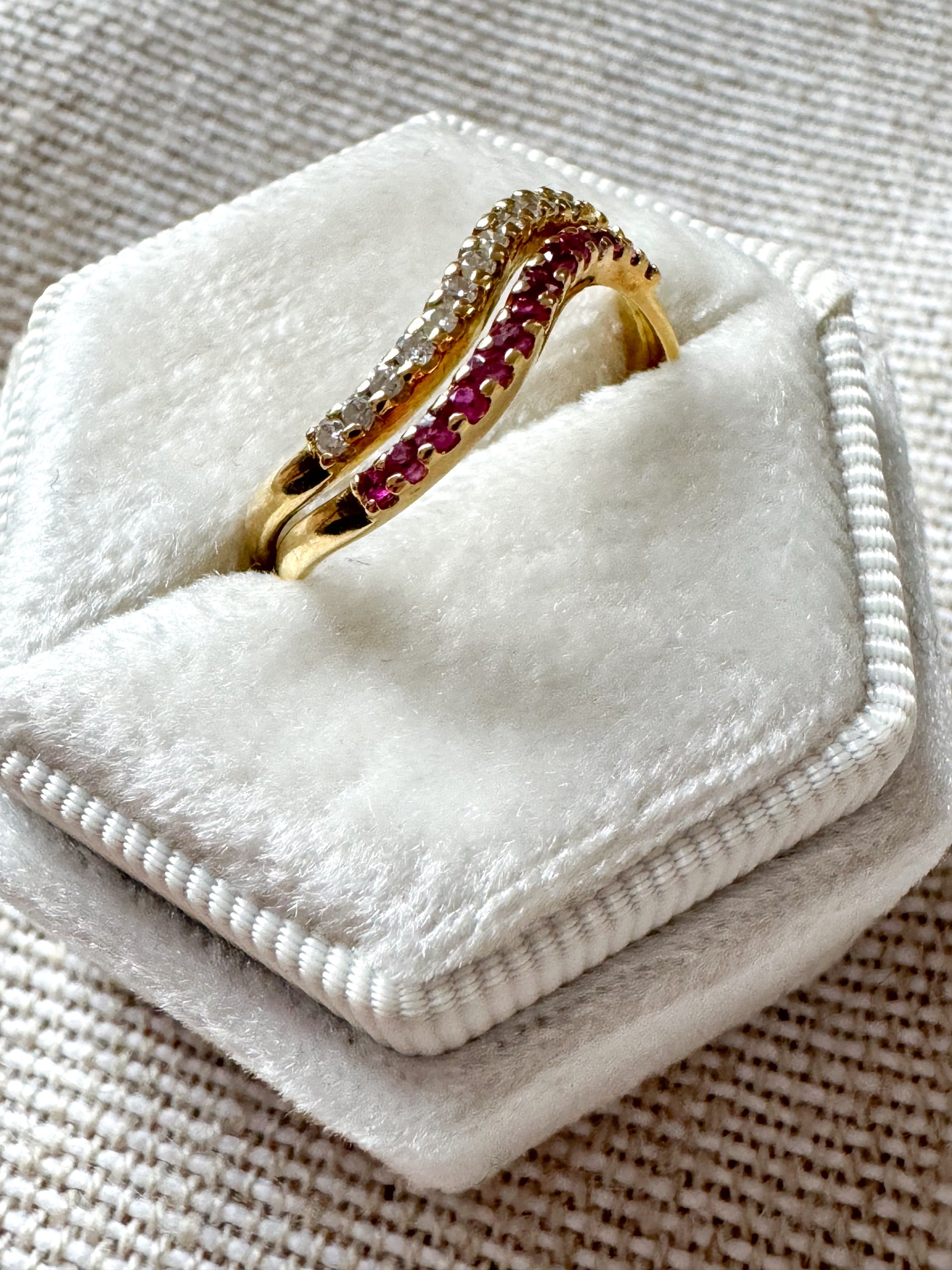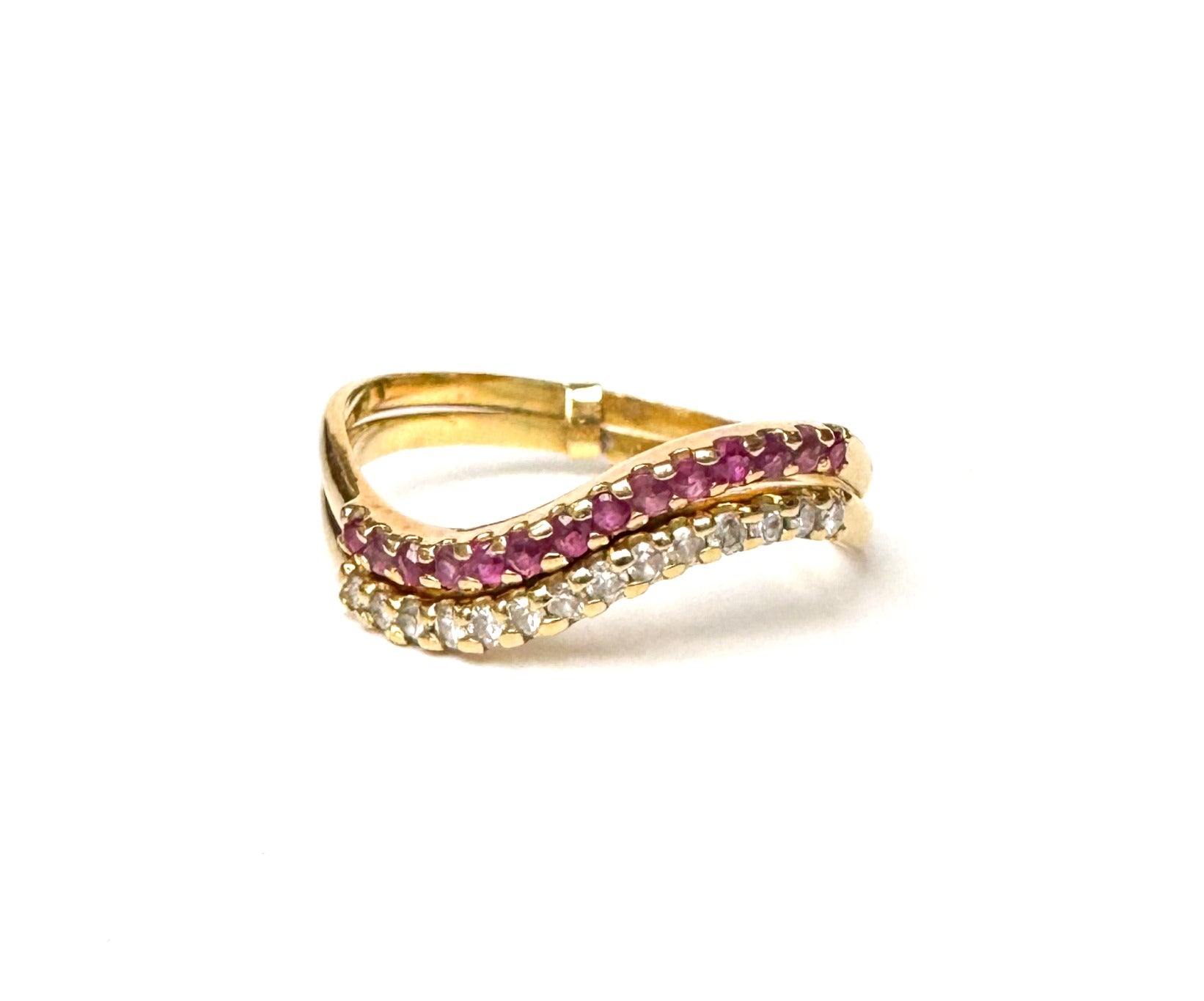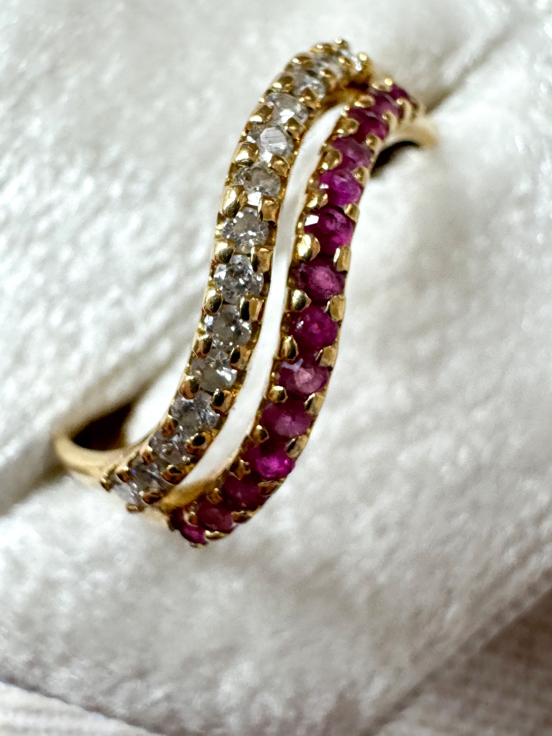 De vintage robijn ring 'Liselotta' is een prachtig juweel dat gemaakt is van 18 karaat goud. De ring bestaat uit twee losse ringen welke aan elkaar vast zijn gemaakt. Beiden hebben een prachtige vorm en de ene ring is bezet met roze robijnen en de andere ring is bezet met diamanten. Robijn is een edelsteen die vaak geassocieerd wordt met passie, liefde en energie. Diamanten staan bekend als de koning van edelstenen en symboliseren eeuwige liefde. Deze ring is dan ook de perfecte keuze voor elke gelegenheid, of je nu op zoek bent naar een verlovingsring, een verjaardagscadeau of natuurlijk als een cadeau voor jezelf.