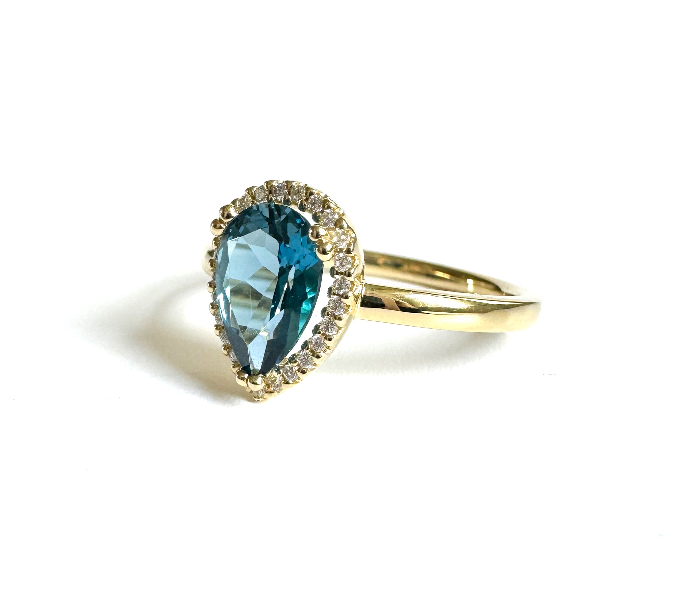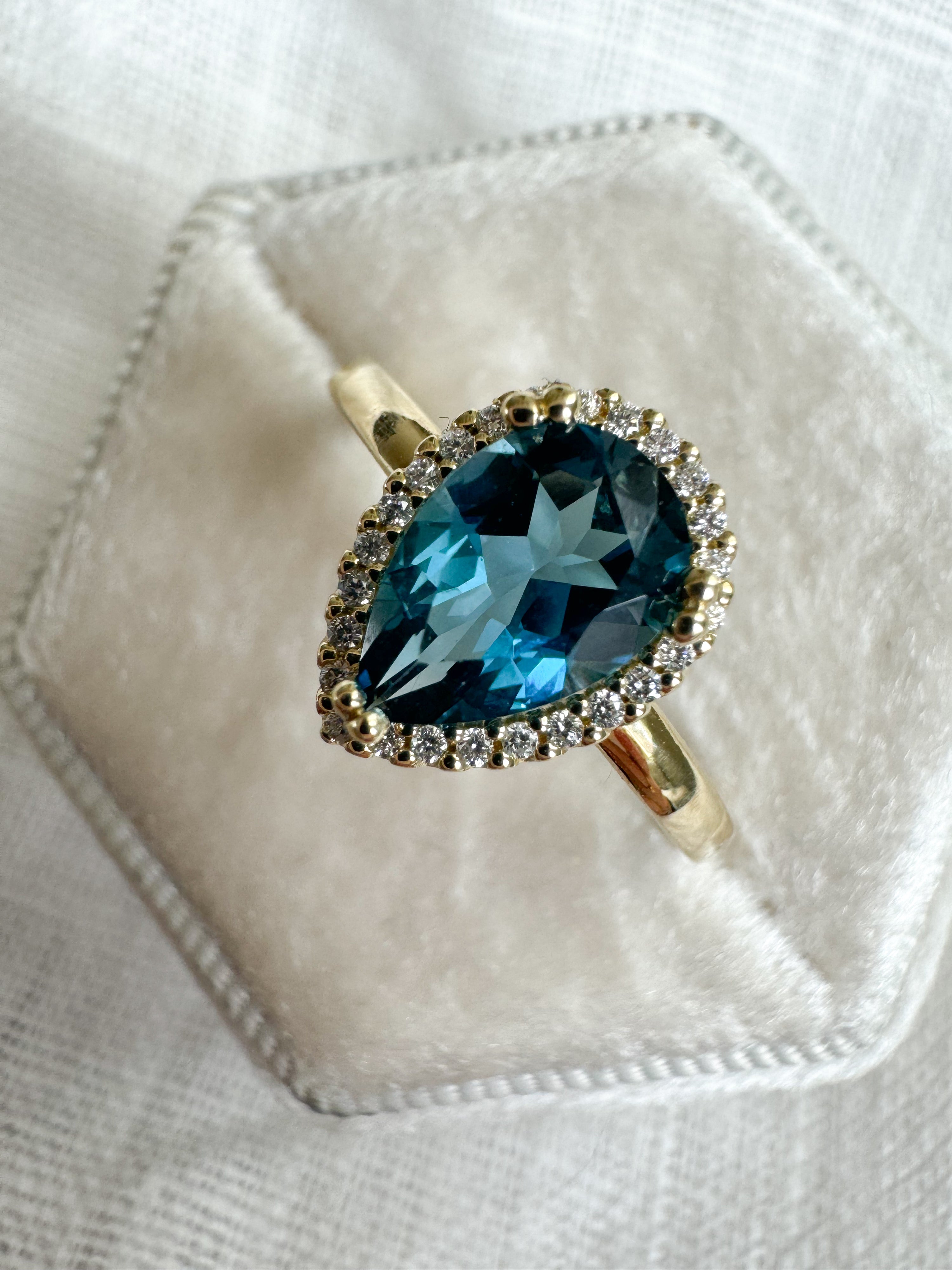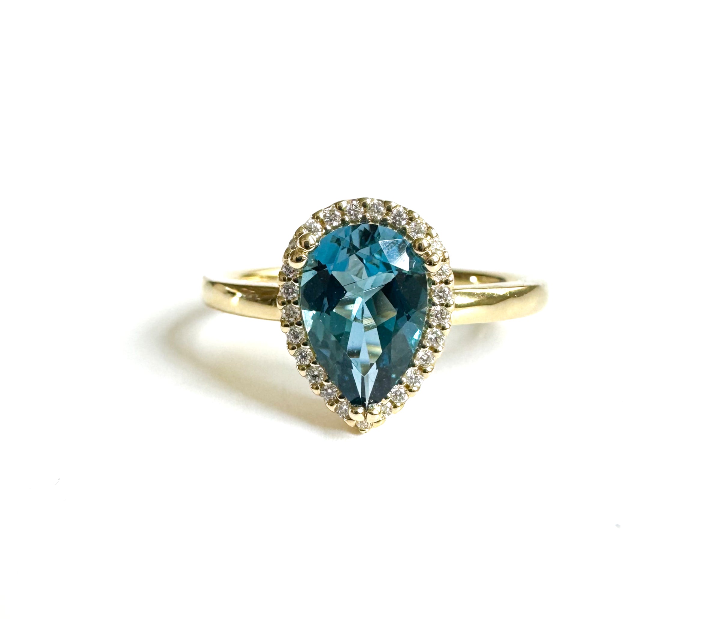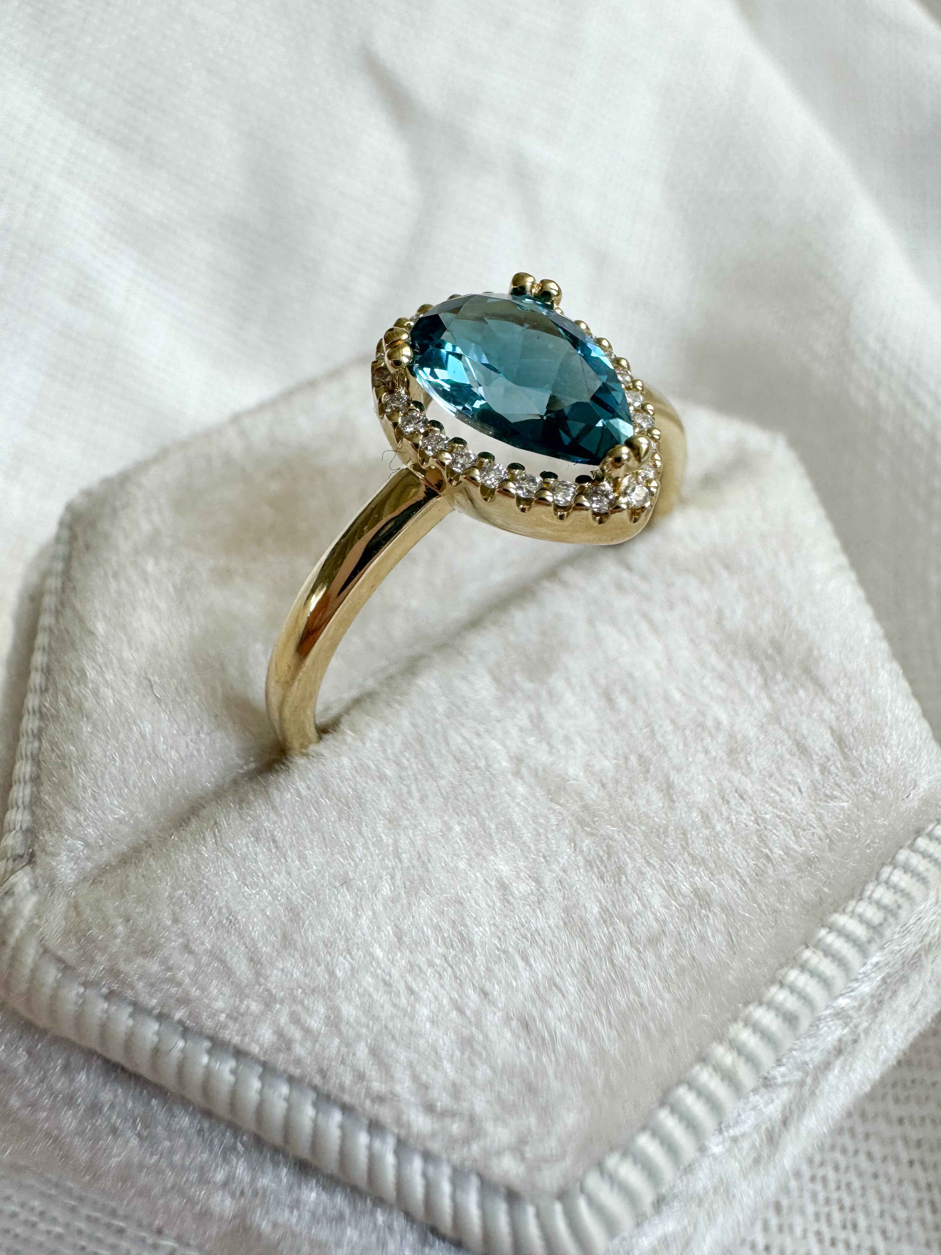 Deze ring genaamd 'Livay' behoort tot onze Exclusieve Dufay collectie. Elk stuk in deze unieke collectie draagt haar eigen charme en is met liefde en vakmanschap gemaakt. De ring is gemaakt van 14 karaat geelgoud met in het midden een betoverende druppelvormige topaas, omringd door een halo van schitterende diamanten.