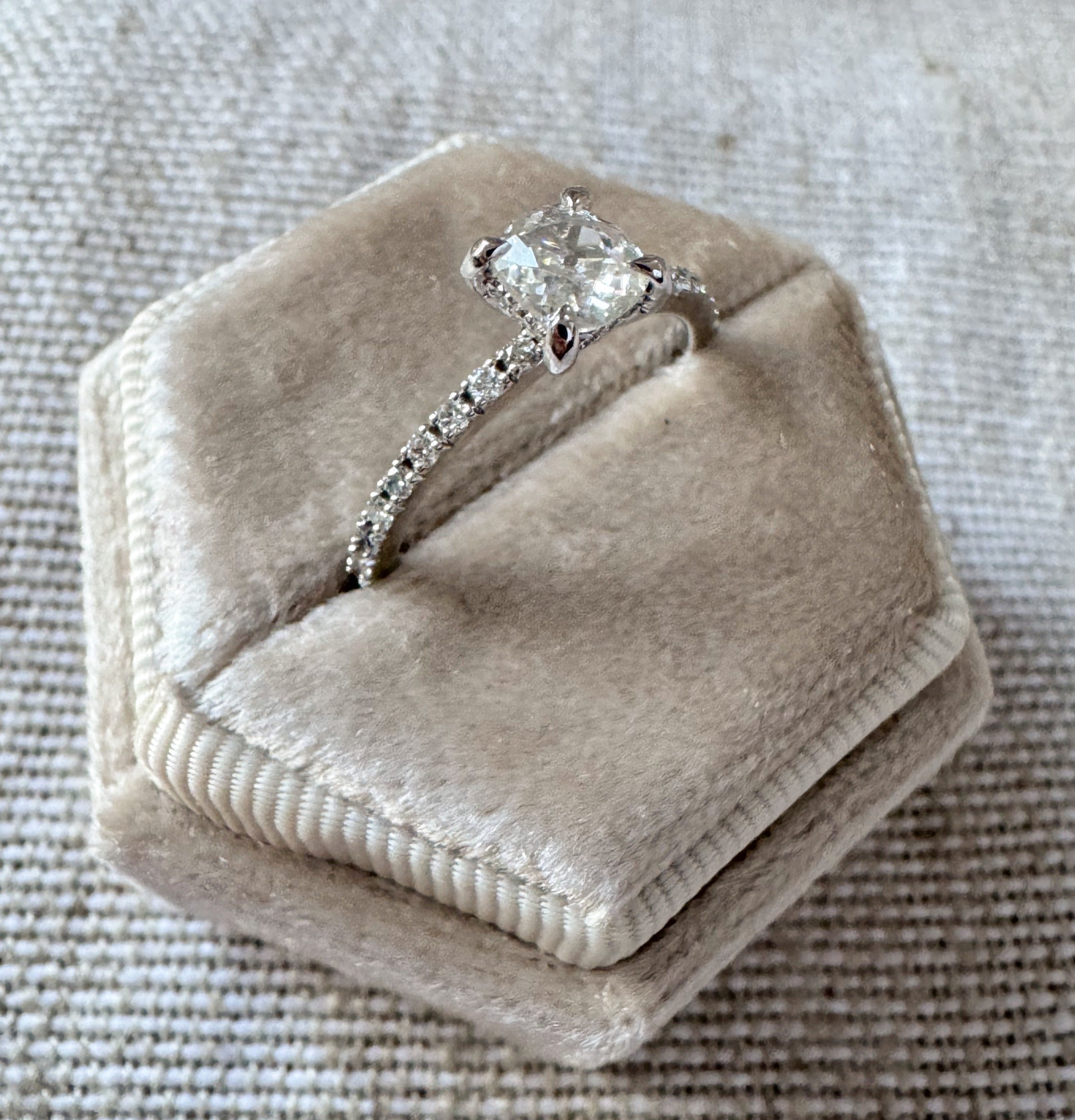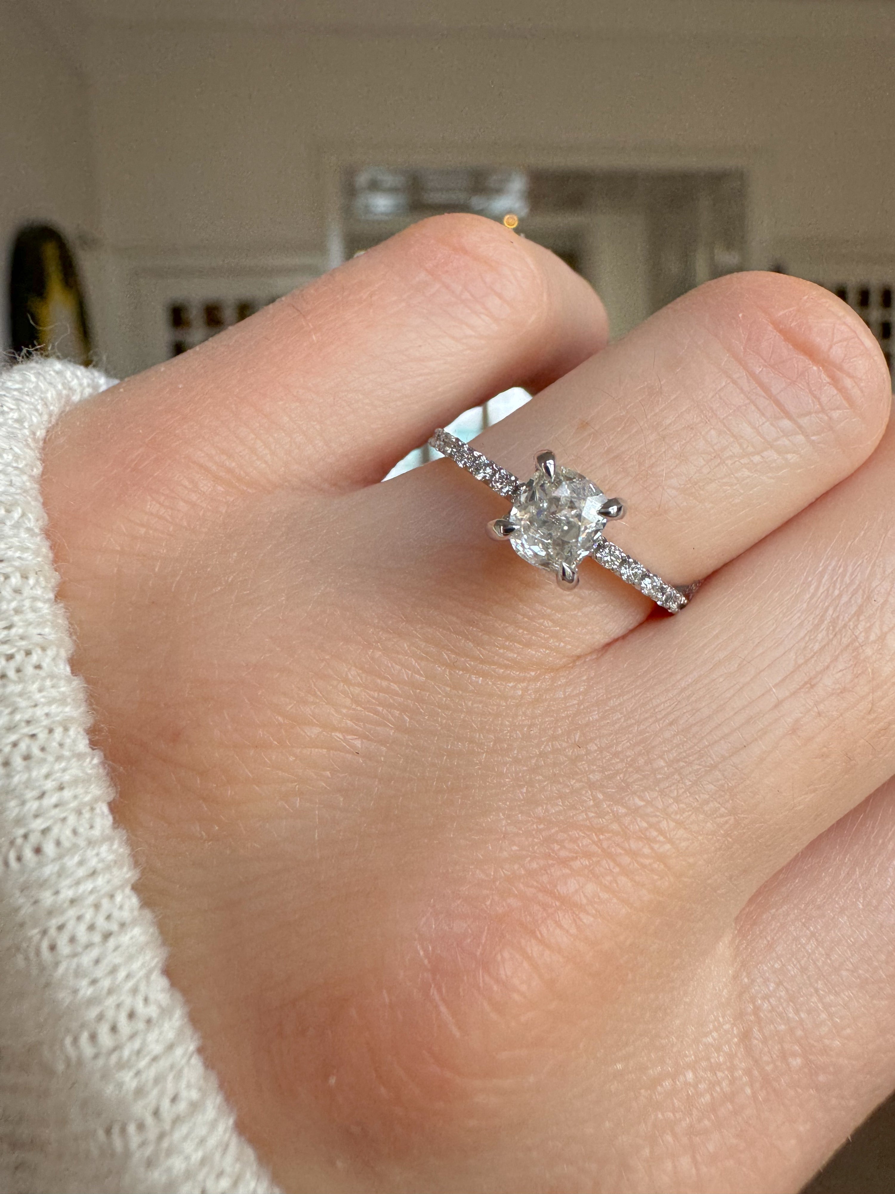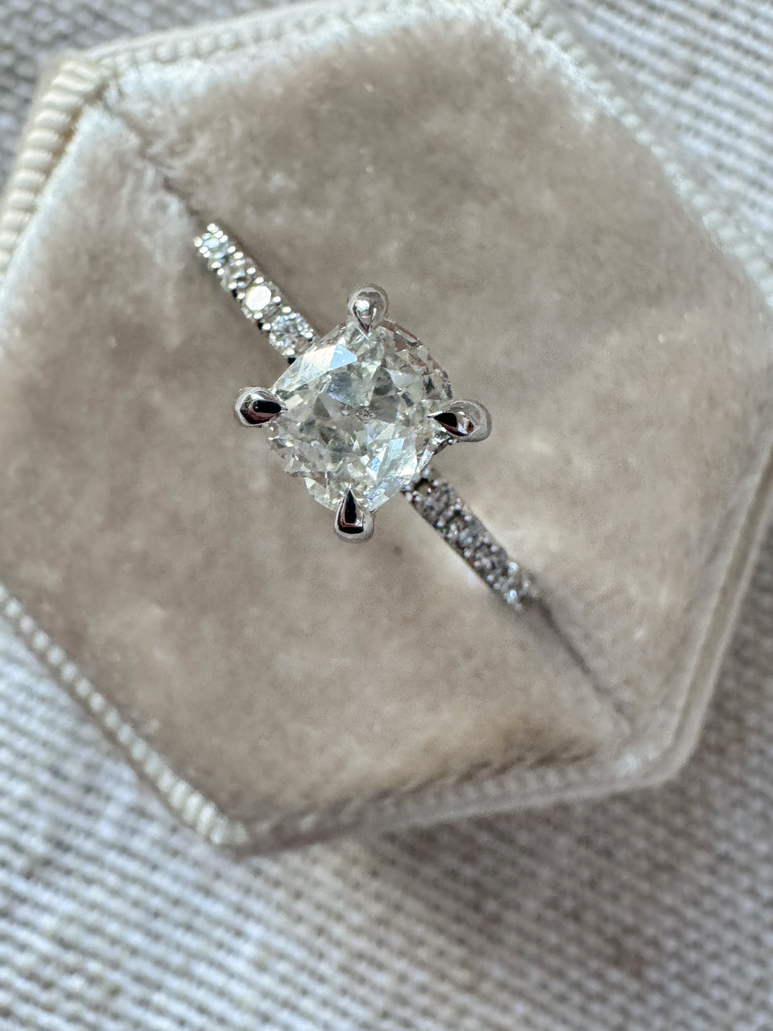 De exclusieve diamant ring 'Eloise' is een klassiek juweel. Deze prachtige ring is gemaakt van 18 karaat wit goud met als middelpunt een antieke kussen geslepen diamant van 0,58 carat. Daarnaast is de ring versierd met 28 briljant geslepen diamantjes. De ring heeft een elegante en klassieke uitstraling en is als je het ons vraagt de perfecte verlovingsring. Diamanten staan bekend als de koning van edelstenen en symboliseren eeuwige liefde, kracht en schoonheid.