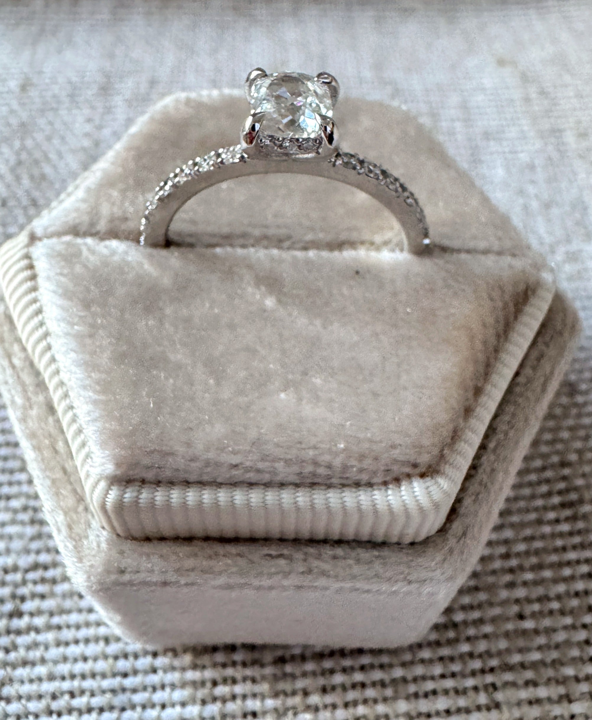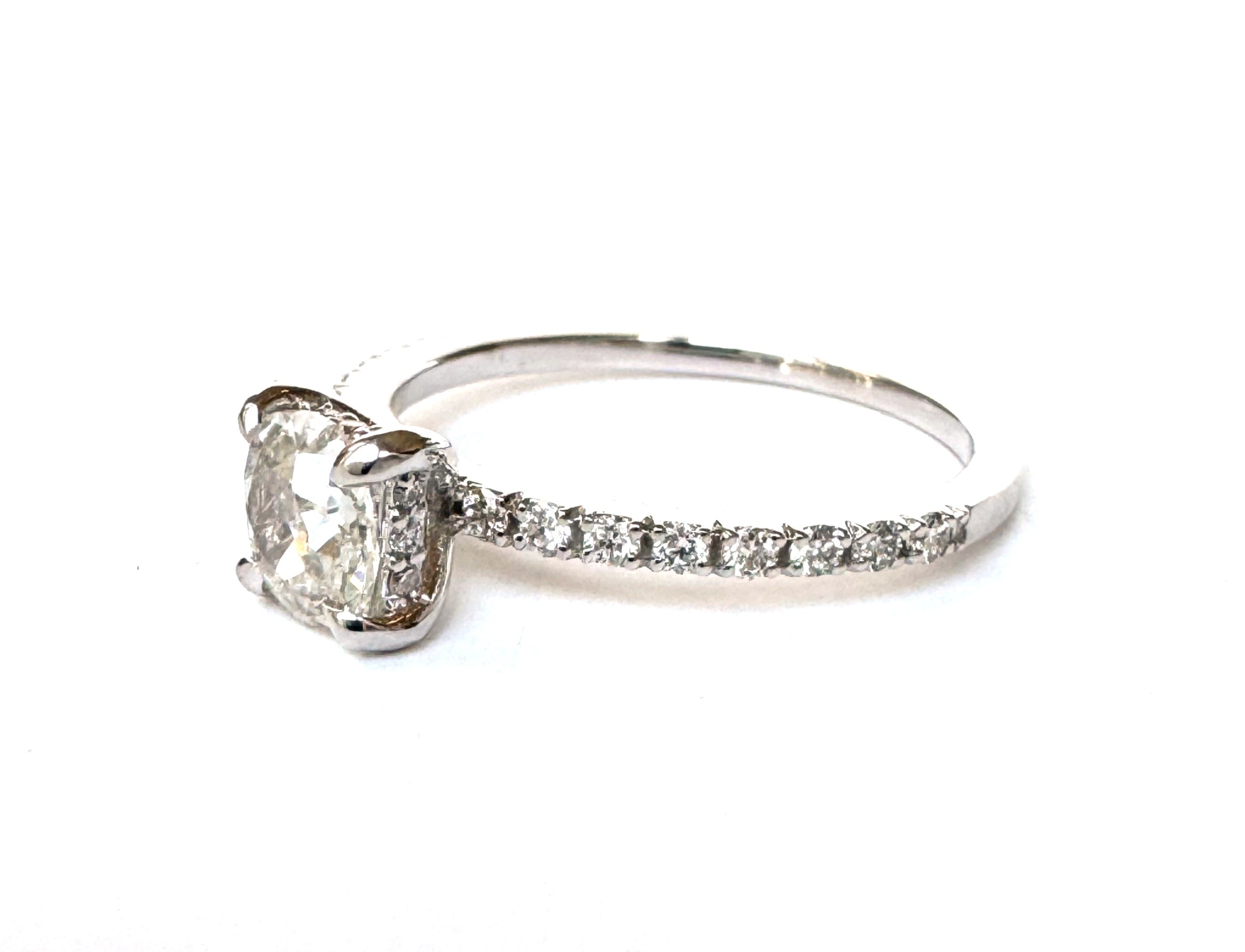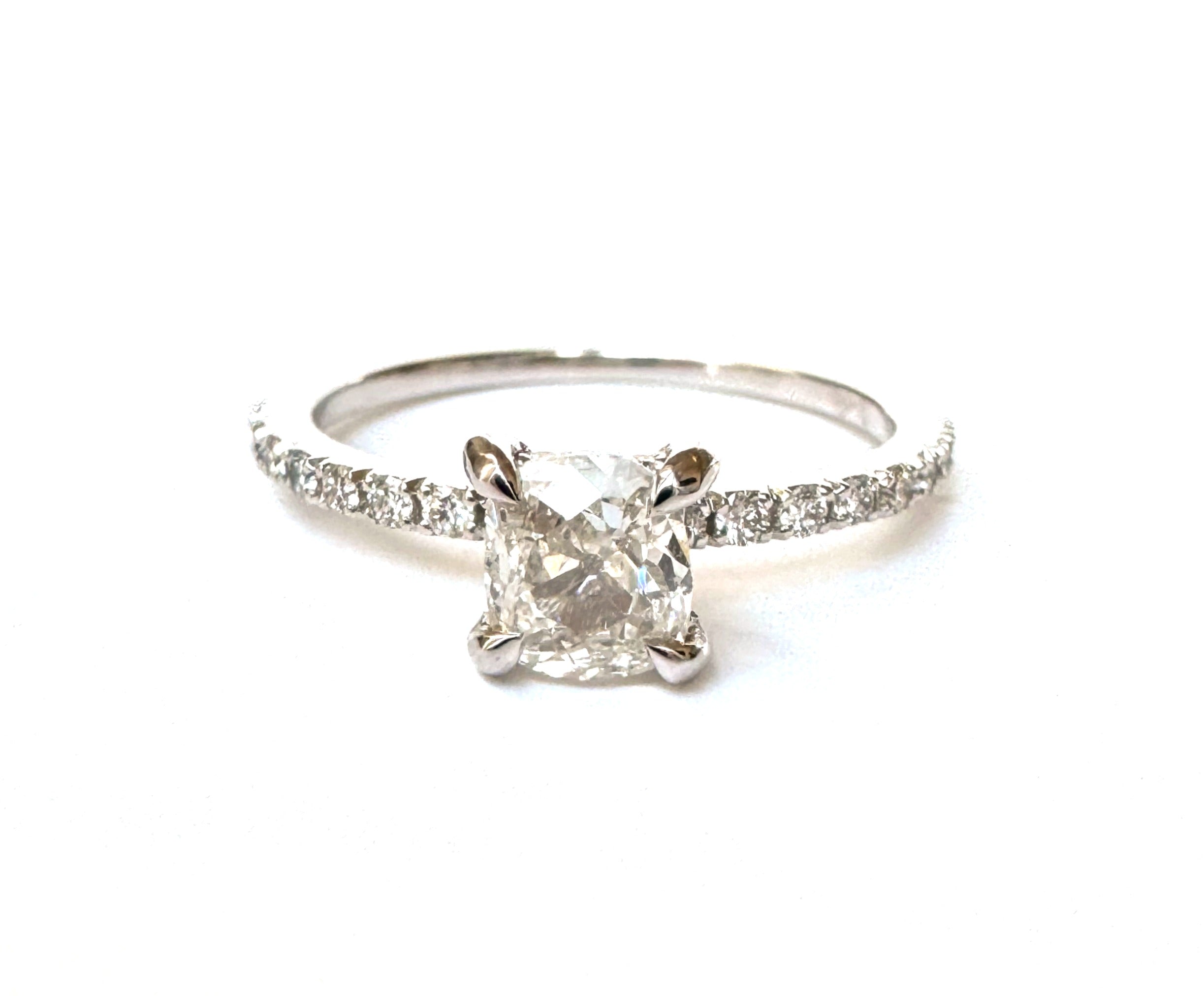 De exclusieve diamant ring 'Eloise' is een klassiek juweel. Deze prachtige ring is gemaakt van 18 karaat wit goud met als middelpunt een antieke kussen geslepen diamant van 0,58 carat. Daarnaast is de ring versierd met 28 briljant geslepen diamantjes. De ring heeft een elegante en klassieke uitstraling en is als je het ons vraagt de perfecte verlovingsring. Diamanten staan bekend als de koning van edelstenen en symboliseren eeuwige liefde, kracht en schoonheid.