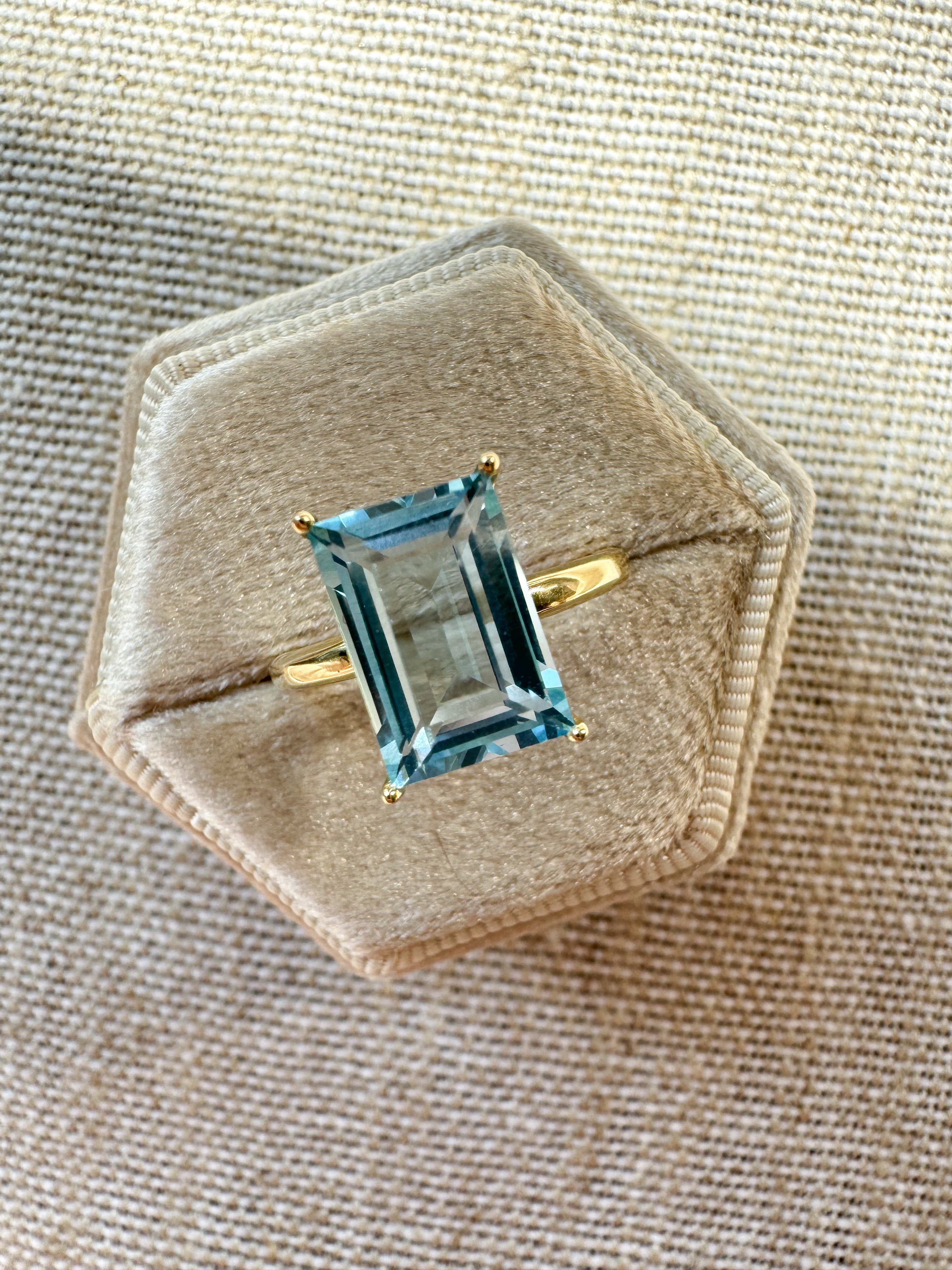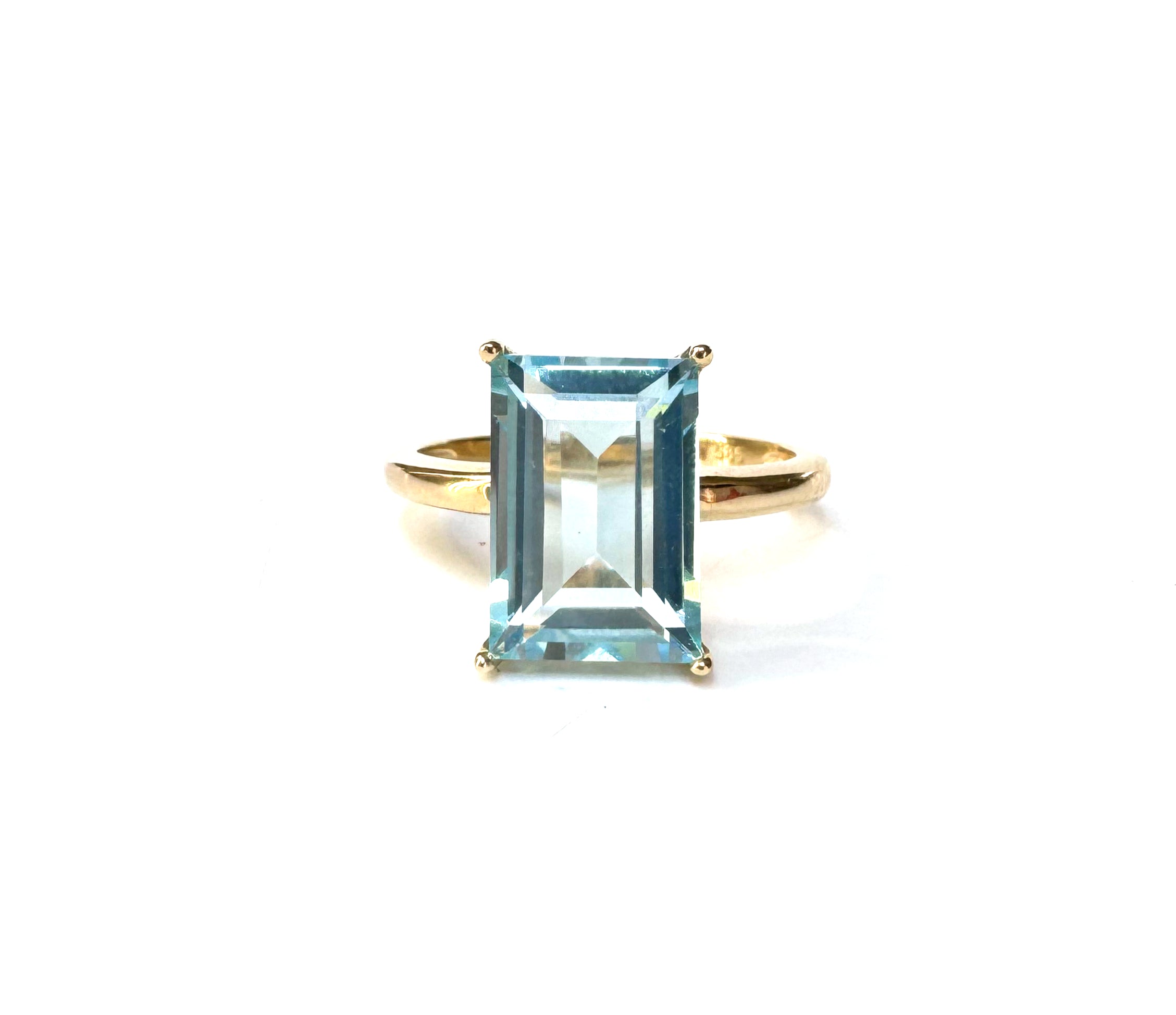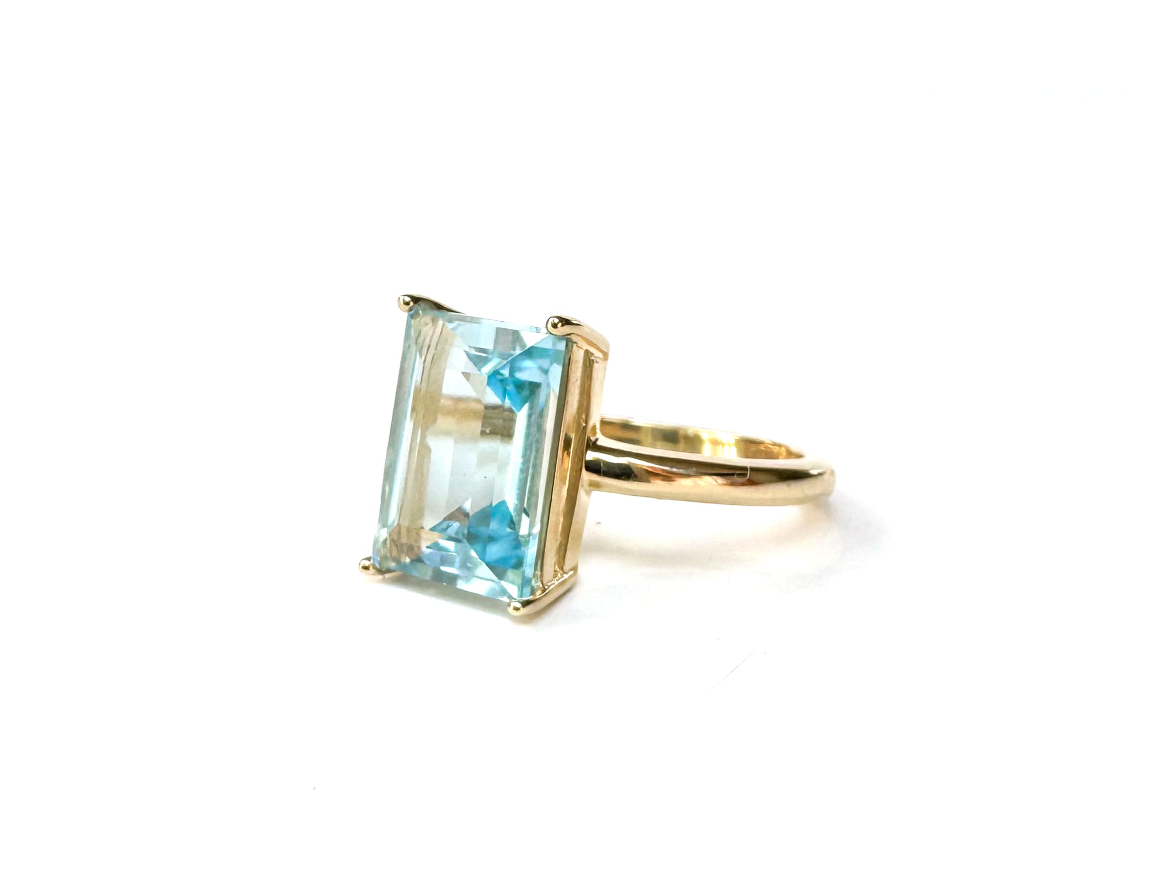 Deze ring genaamd 'Evony' behoort tot onze Exclusieve Dufay collectie. Elk stuk in deze unieke collectie draagt haar eigen charme en is met liefde en vakmanschap gemaakt. De ring is gemaakt van 14 karaat geelgoud met in het midden een prachtige rechthoekige topaas steen in een lichtblauwe kleur.