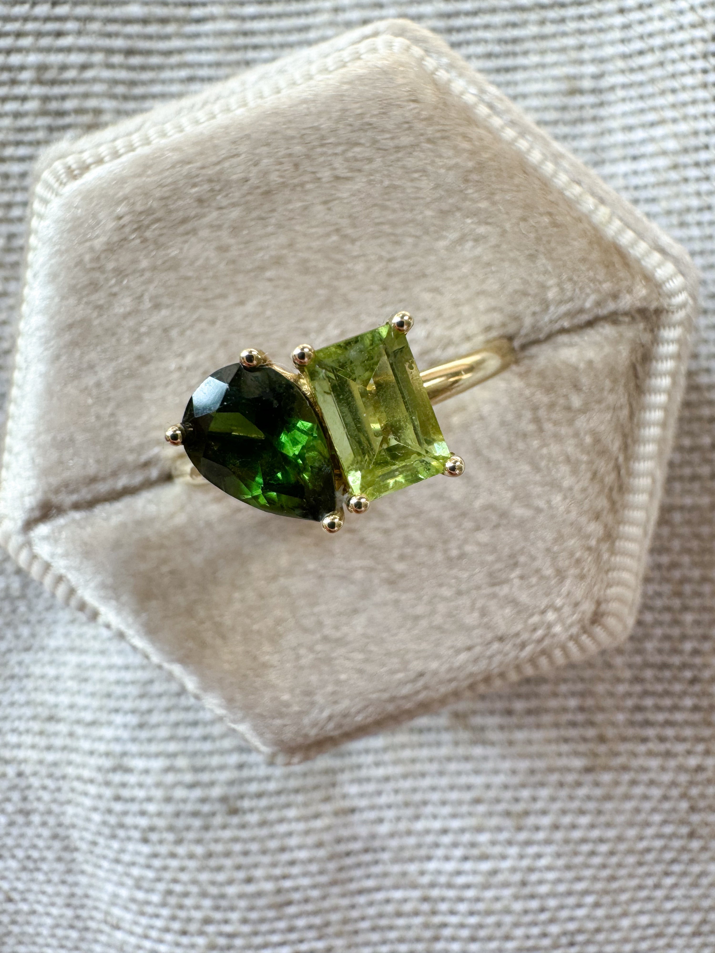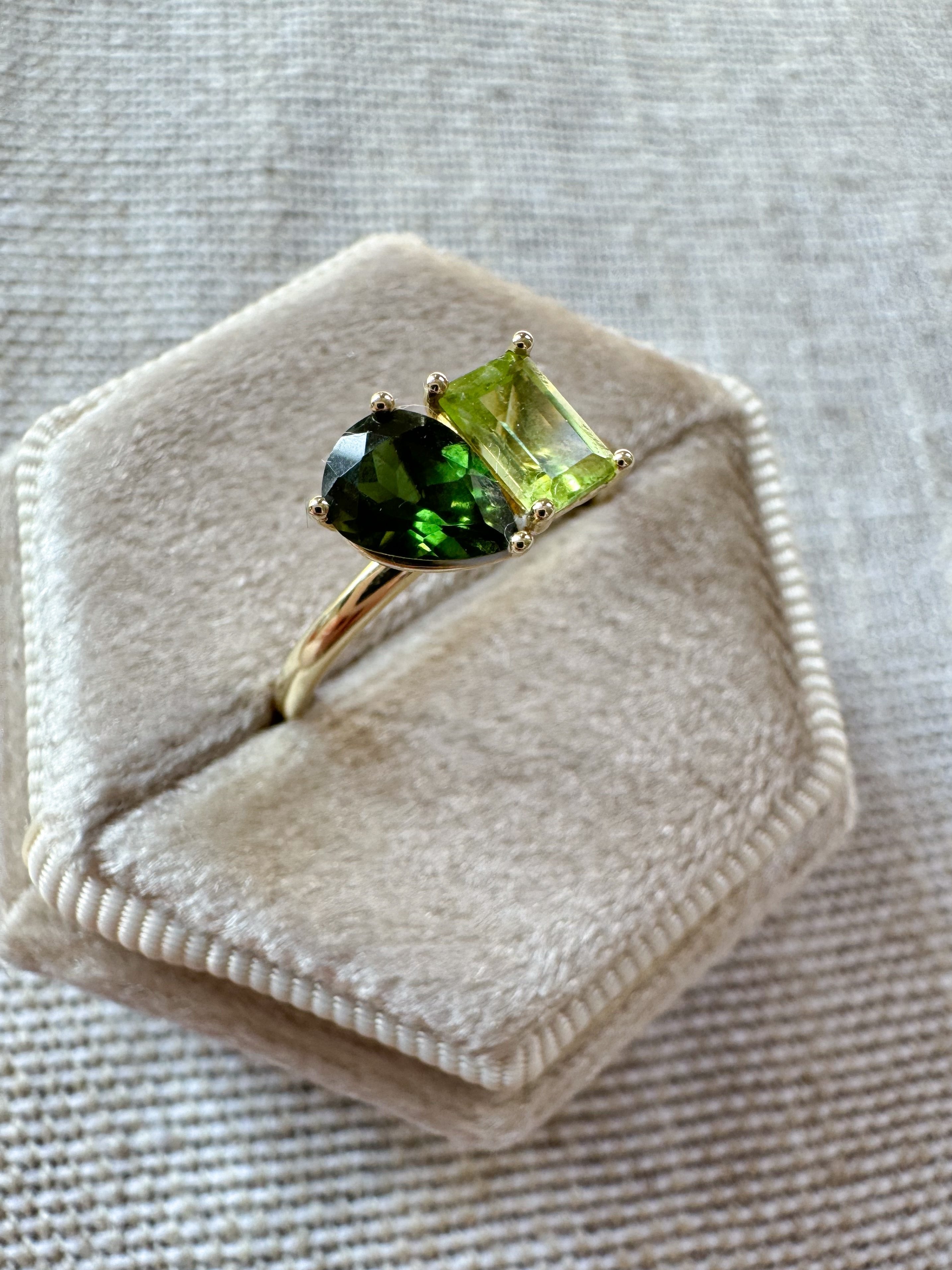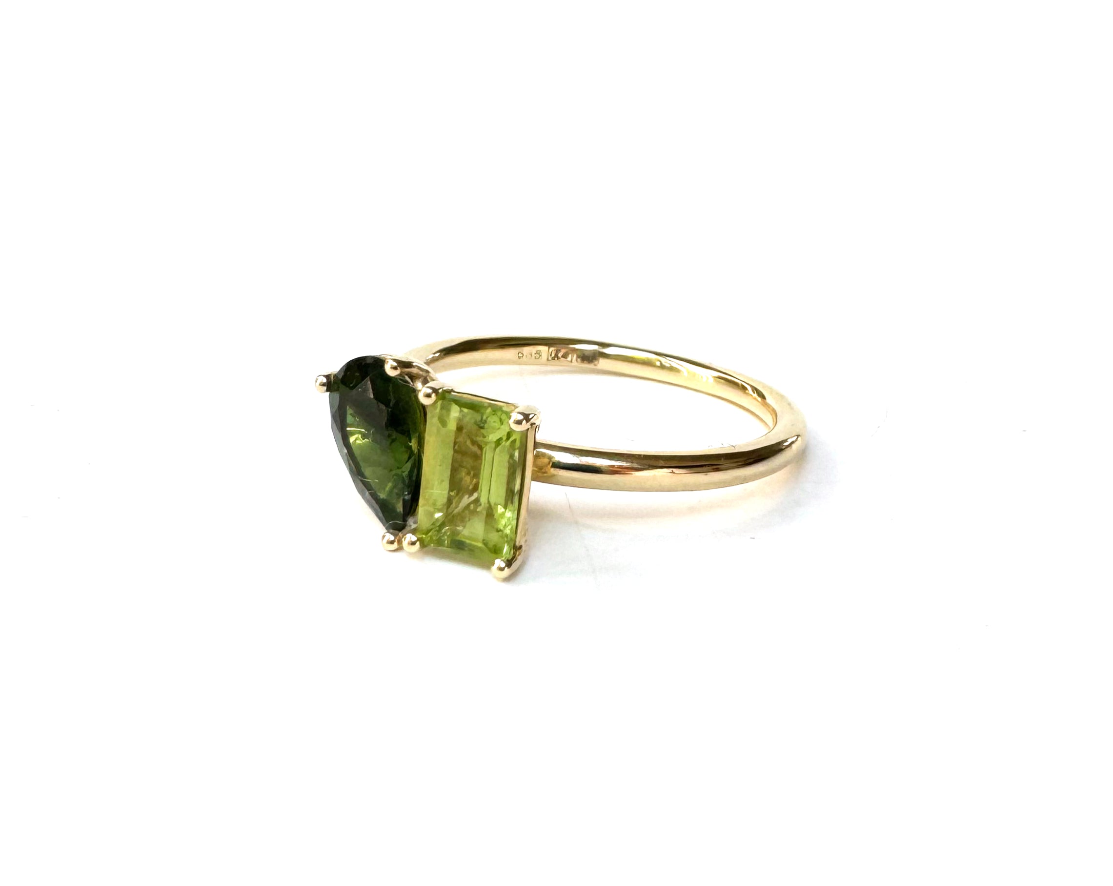 Deze ring genaamd 'Adrianna' behoort tot onze Exclusieve Dufay collectie. Elk stuk in deze unieke collectie draagt zijn eigen charme en is met liefde en vakmanschap gemaakt. De ring is vervaardigd van 14 karaat geelgoud met in het midden een peridot en een toermalijn steen gezet in een toi-et-moi zetting.