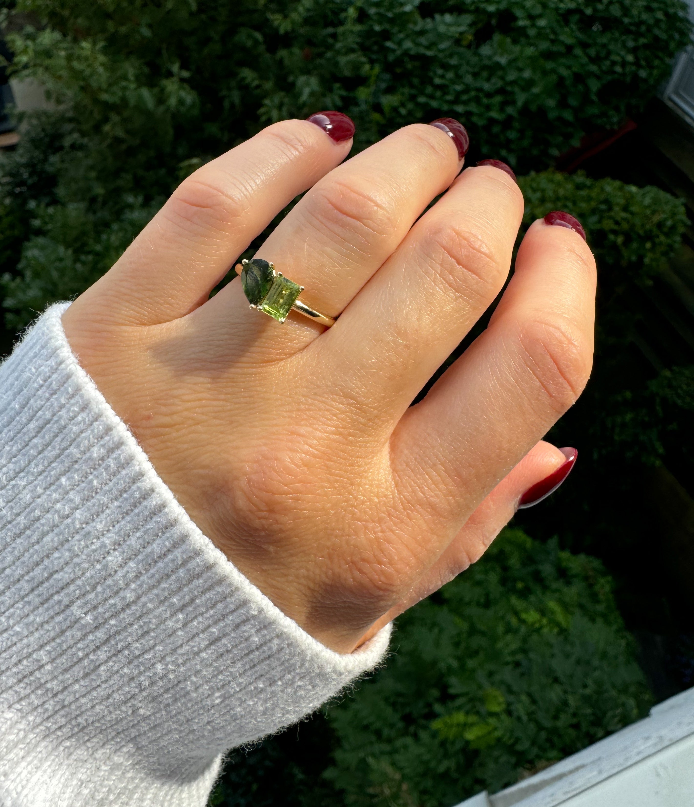 De 'Adrianna' ring heeft een klassieke uitstraling uit met als middelpunt de prachtige combinatie van de lichtgroene peridot en donkergroene toermalijn. De peridot steen staat onder andere bekend als een steen die staat voor liefde, loyaliteit en eerlijkheid. Toermalijn heeft daarentegen een beschermende en kalmerende werking. Deze ring kan gegeven worden bij verschillende bijzondere momenten, zoals verjaardagen, als verlovingsring, als cadeau ter ere van prestaties of natuurlijk als een geschenk aan jezelf.