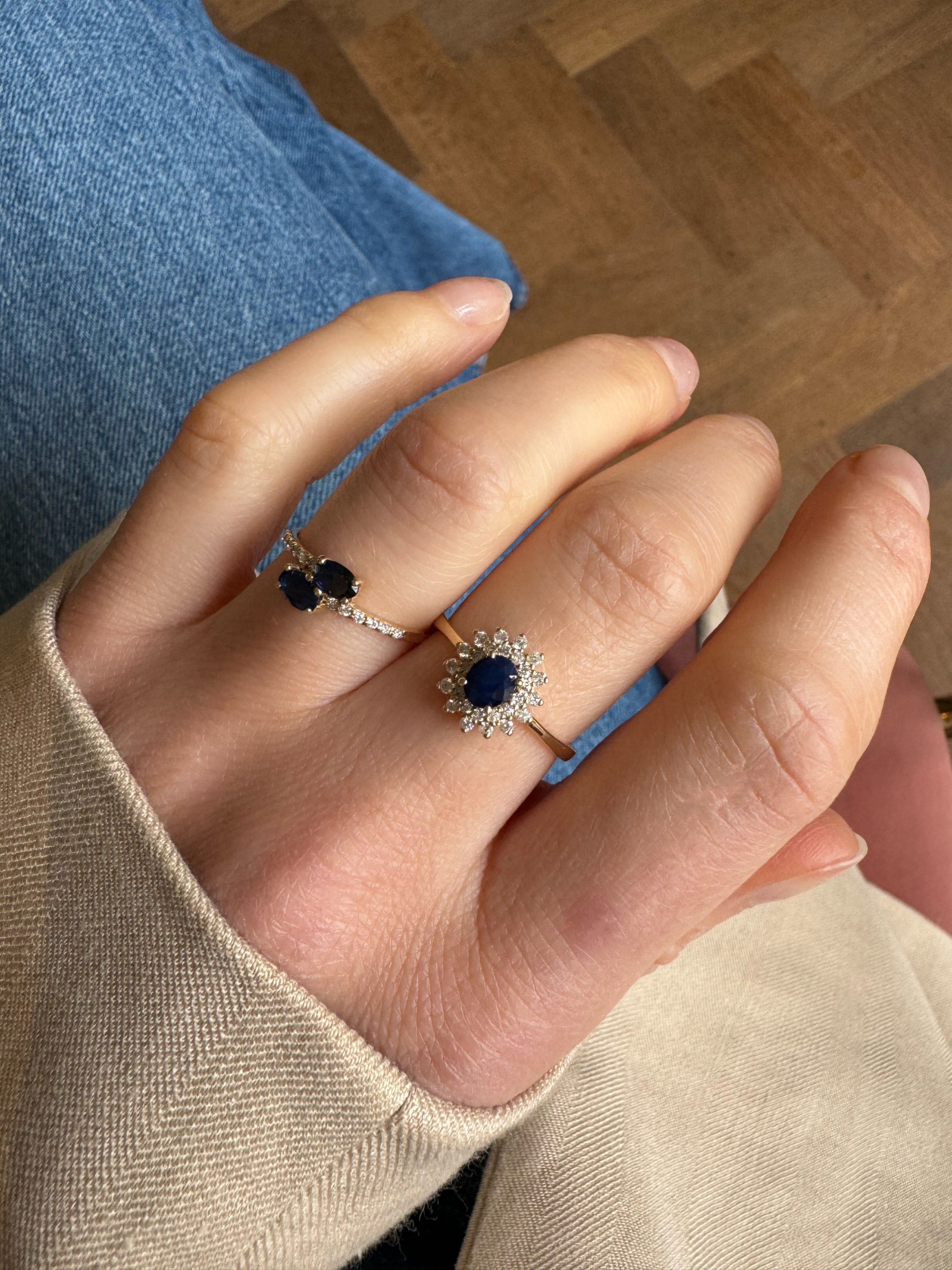 Deze ring straalt een tijdloze elegantie uit, en de diepe blauwe kleur van de saffieren geeft het een klassieke uitstraling. Saffier staat symbool voor wijsheid, royalty en spirituele groei, en wordt vaak gezien als een steen van bescherming en innerlijke vrede. Of je nu op zoek bent naar een unieke ring voor een speciale gelegenheid of gewoon een prachtig geschenk aan jezelf, de 'Lucie' ring zal zeker een bijzondere toevoeging zijn aan je juwelencollectie.