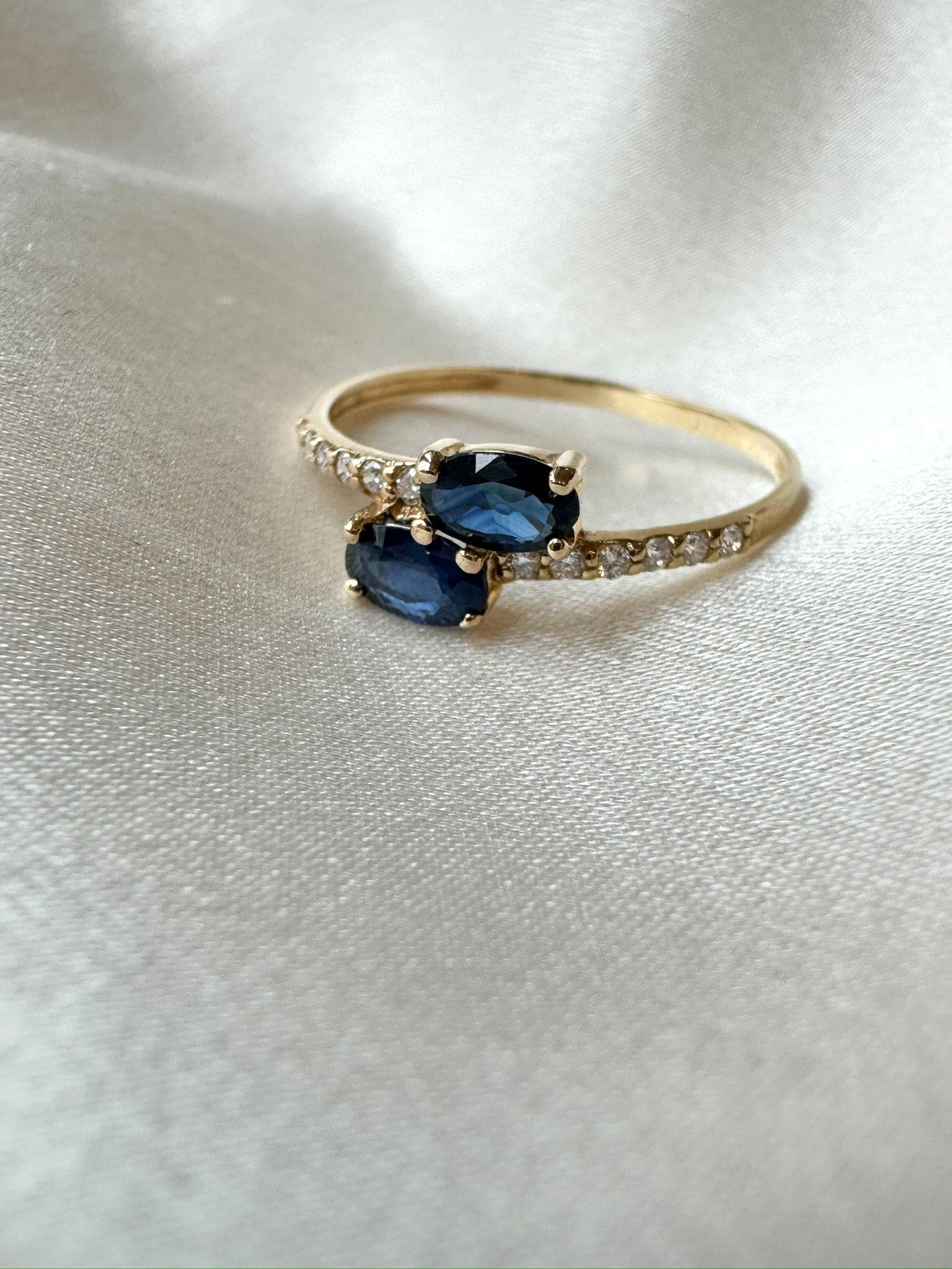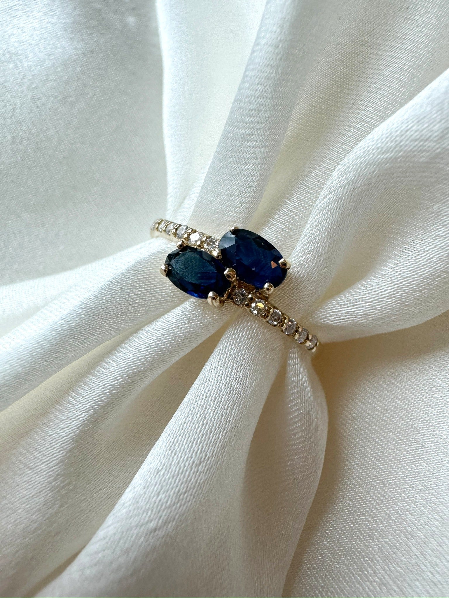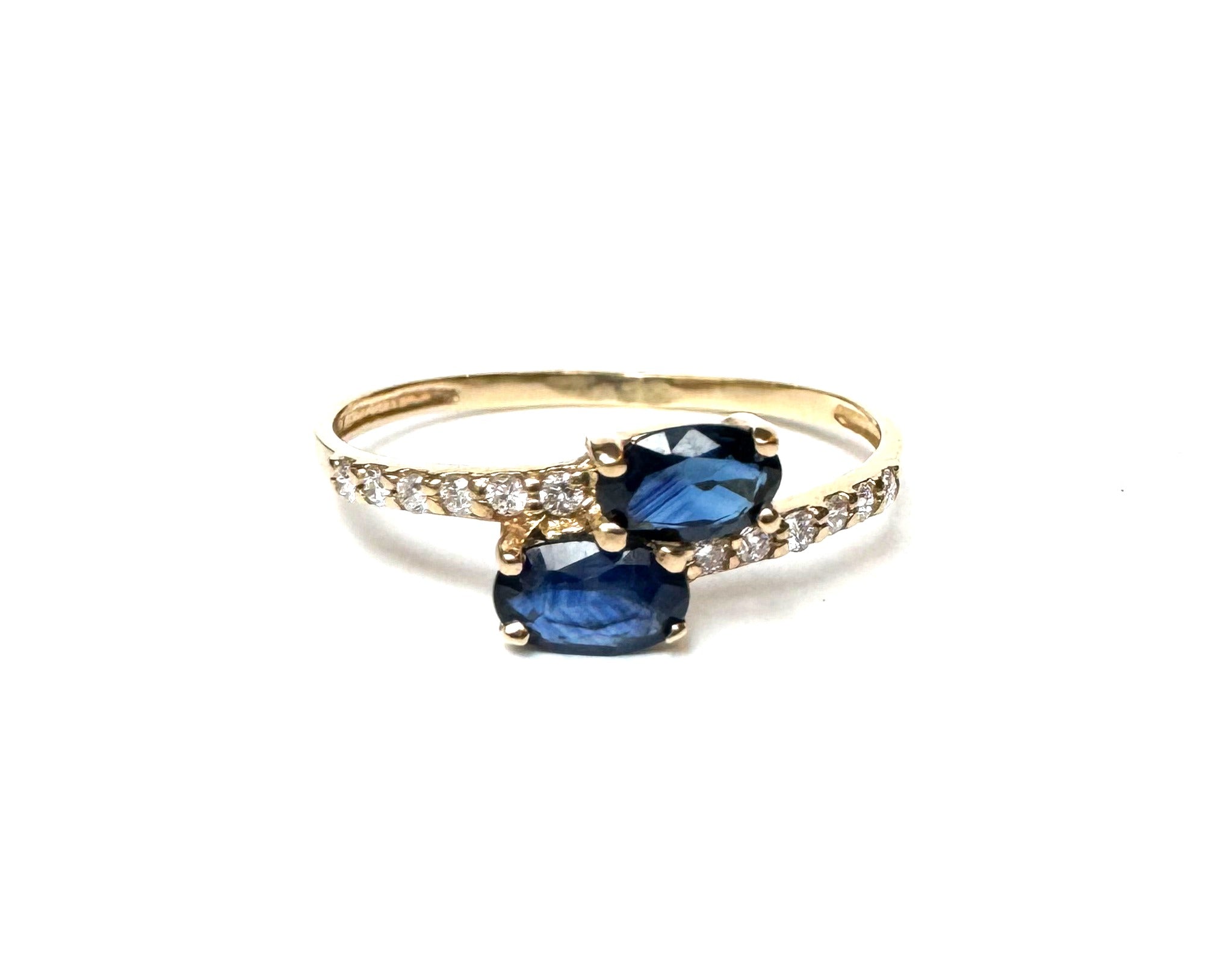 De ring genaamd 'Lucie' is een pronkstuk uit onze Exclusieve Dufay collectie. Elk stuk in deze betoverende collectie is met toewijding en vakmanschap vervaardigd, en de 'Lucie' is daar geen uitzondering op. Deze prachtige ring is gemaakt van 14 karaat geelgoud en heeft als middelpunt twee schitterende saffieren stenen die elegant gezet zijn in een gedraaide zetting. De band van de ring is verfraaid met glinsterende diamantjes, wat zorgt voor een extra vleugje verfijning.