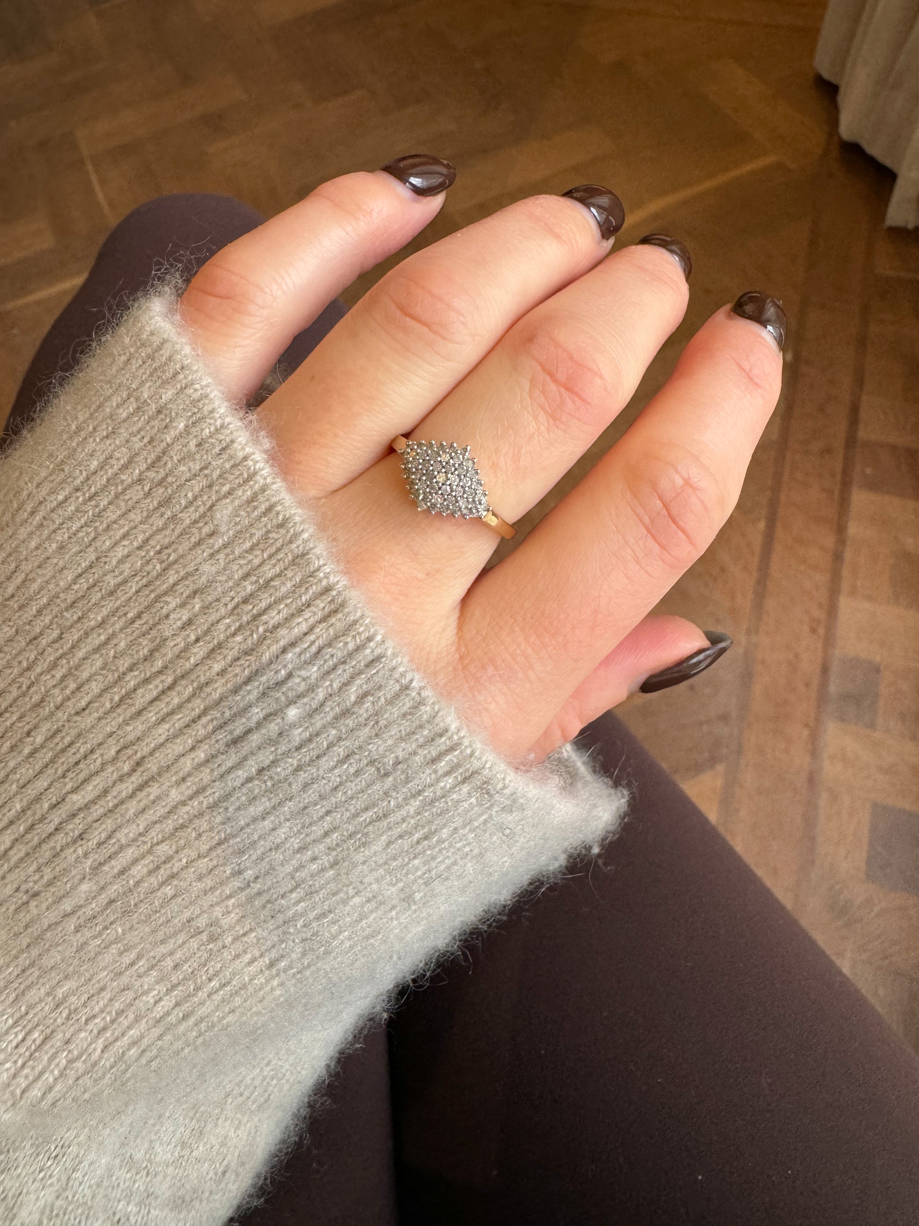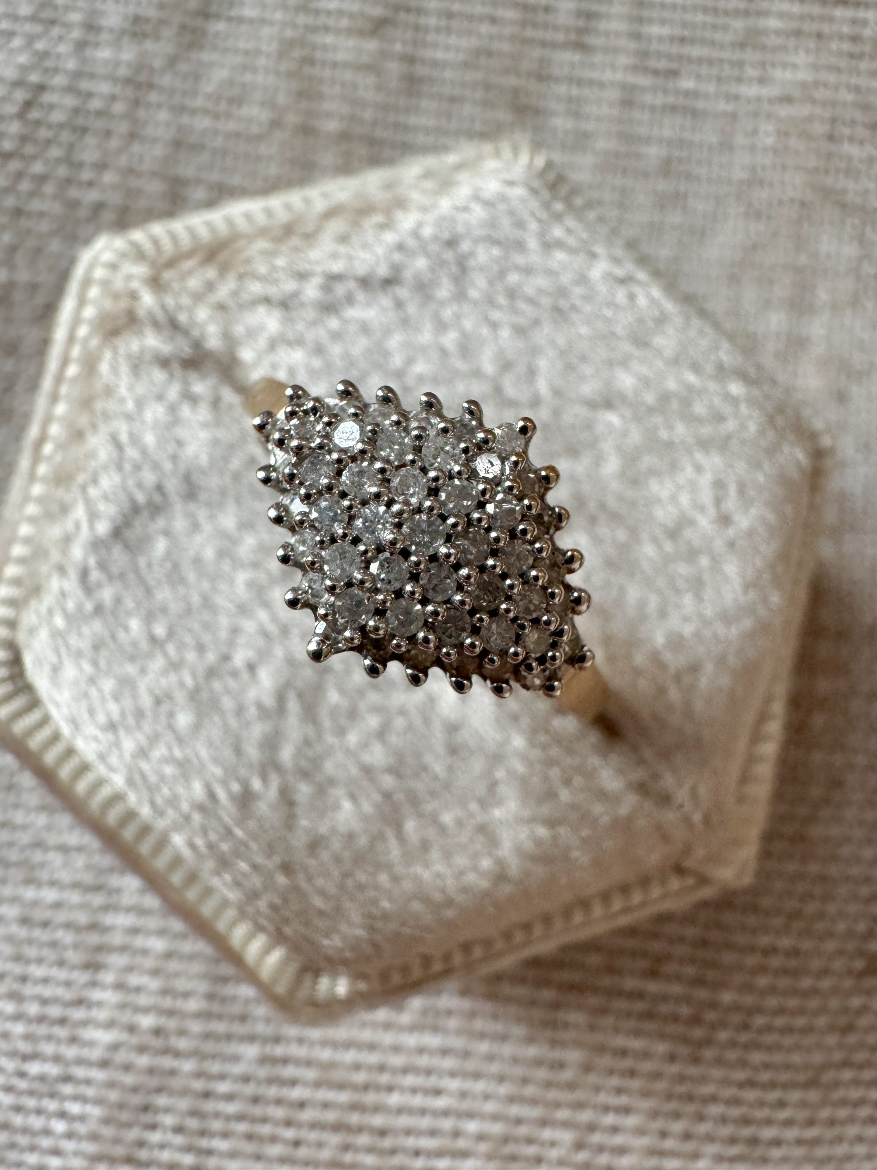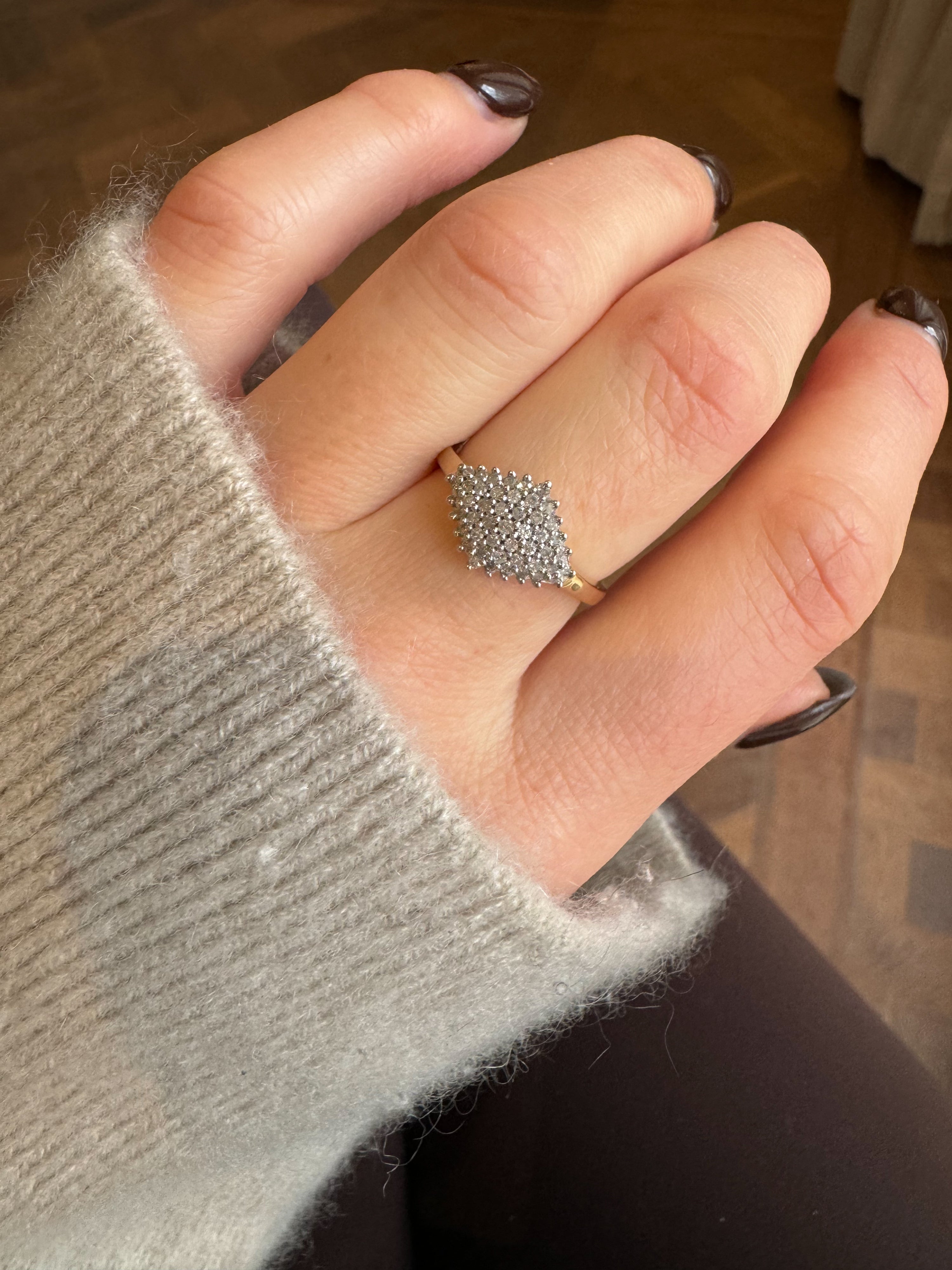 De vintage diamant ring 'Aimely' is een klassiek juweel. De ring is vervaardigd uit 9 karaat geelgoud en versierd met schitterende diamanten, die in een verfijnde ruitvorm zijn gezet. Deze bijzondere zetting geeft de ring een unieke uitstraling, terwijl de klassieke eenvoud haar een tijdloze charme verleent.
