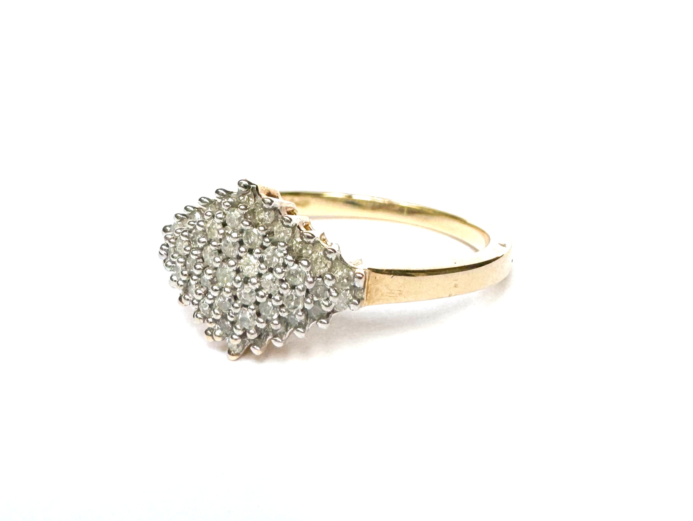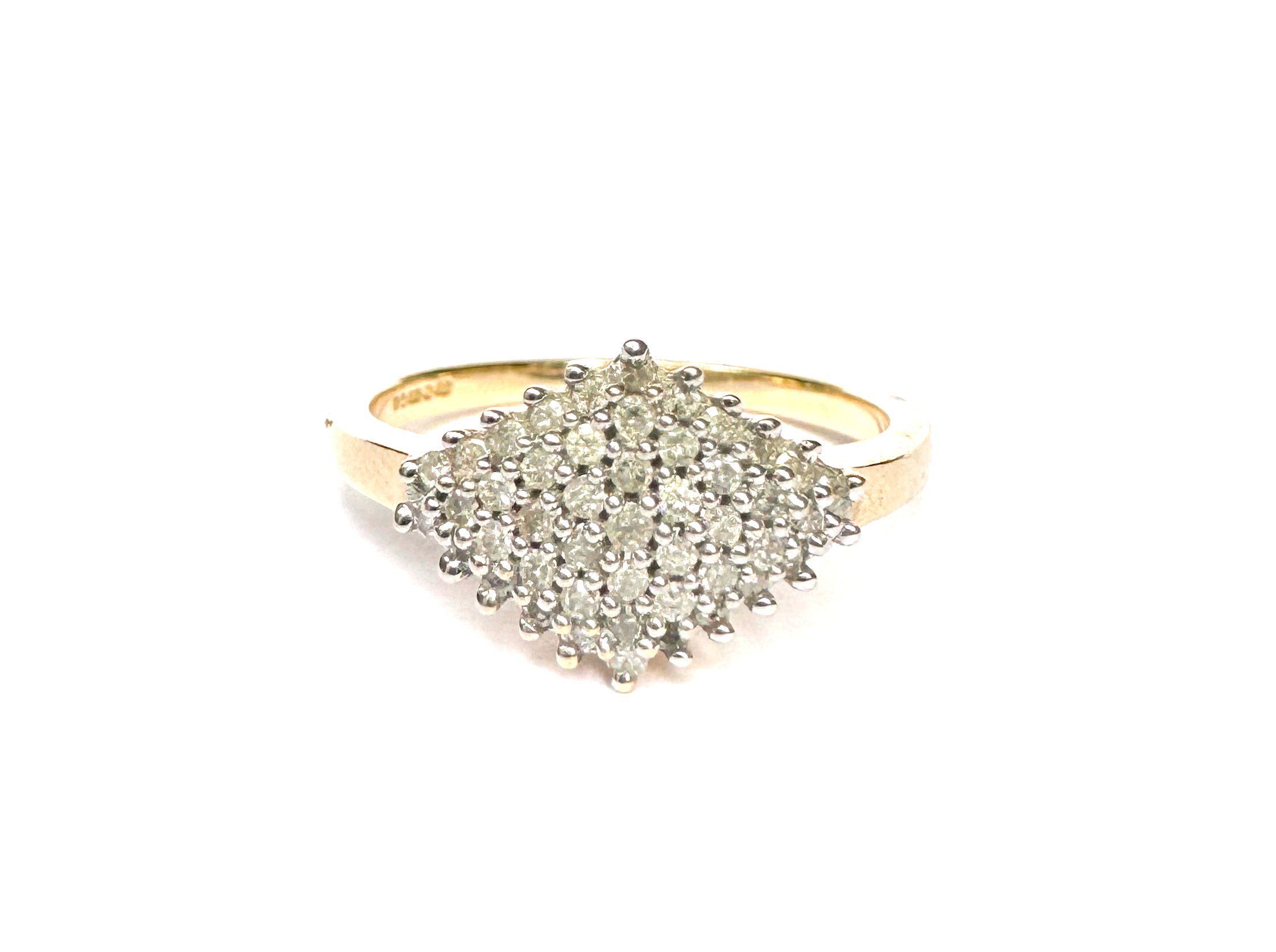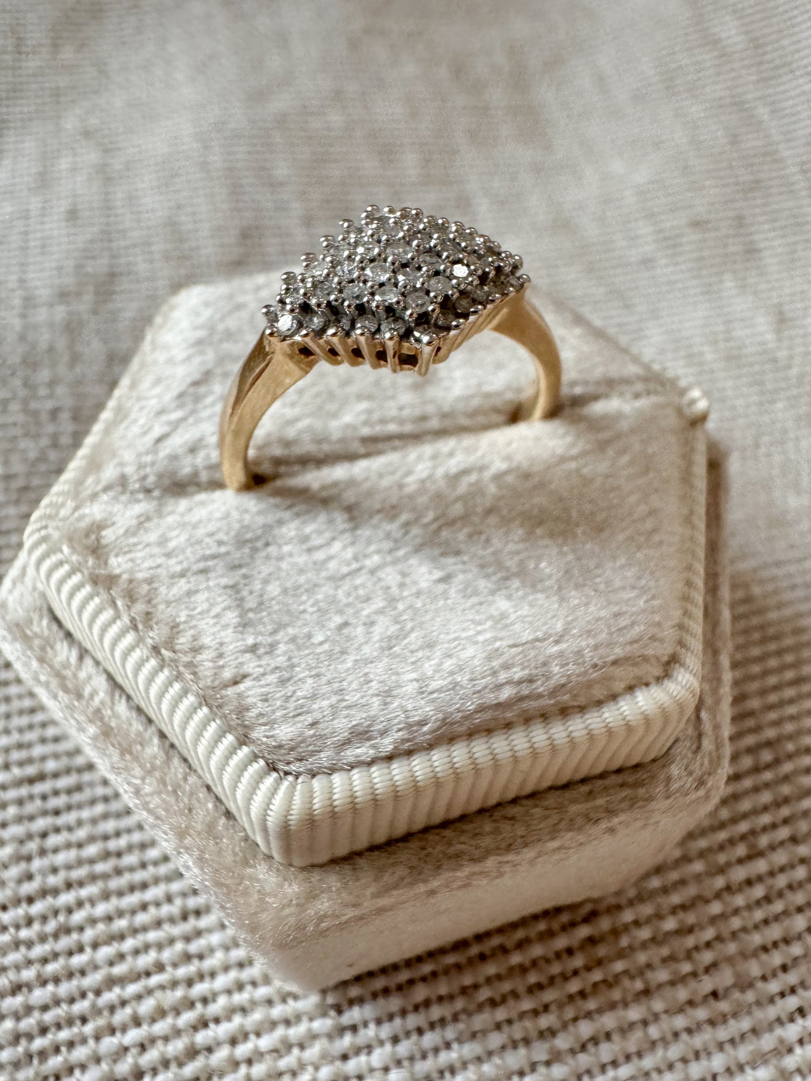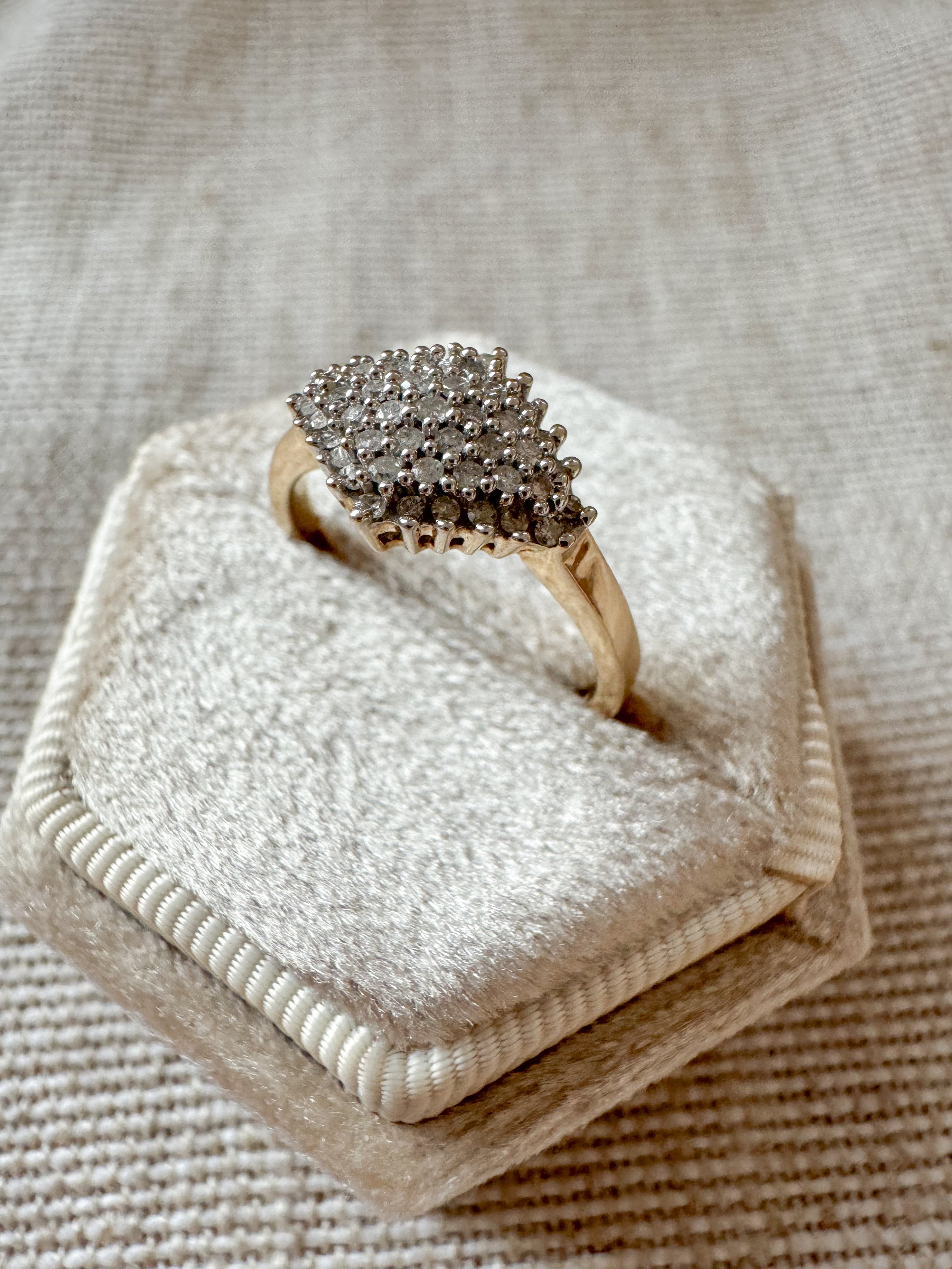 De vintage diamant ring 'Aimely' is een klassiek juweel. De ring is vervaardigd uit 9 karaat geelgoud en versierd met schitterende diamanten, die in een verfijnde ruitvorm zijn gezet. Deze bijzondere zetting geeft de ring een unieke uitstraling, terwijl de klassieke eenvoud haar een tijdloze charme verleent.