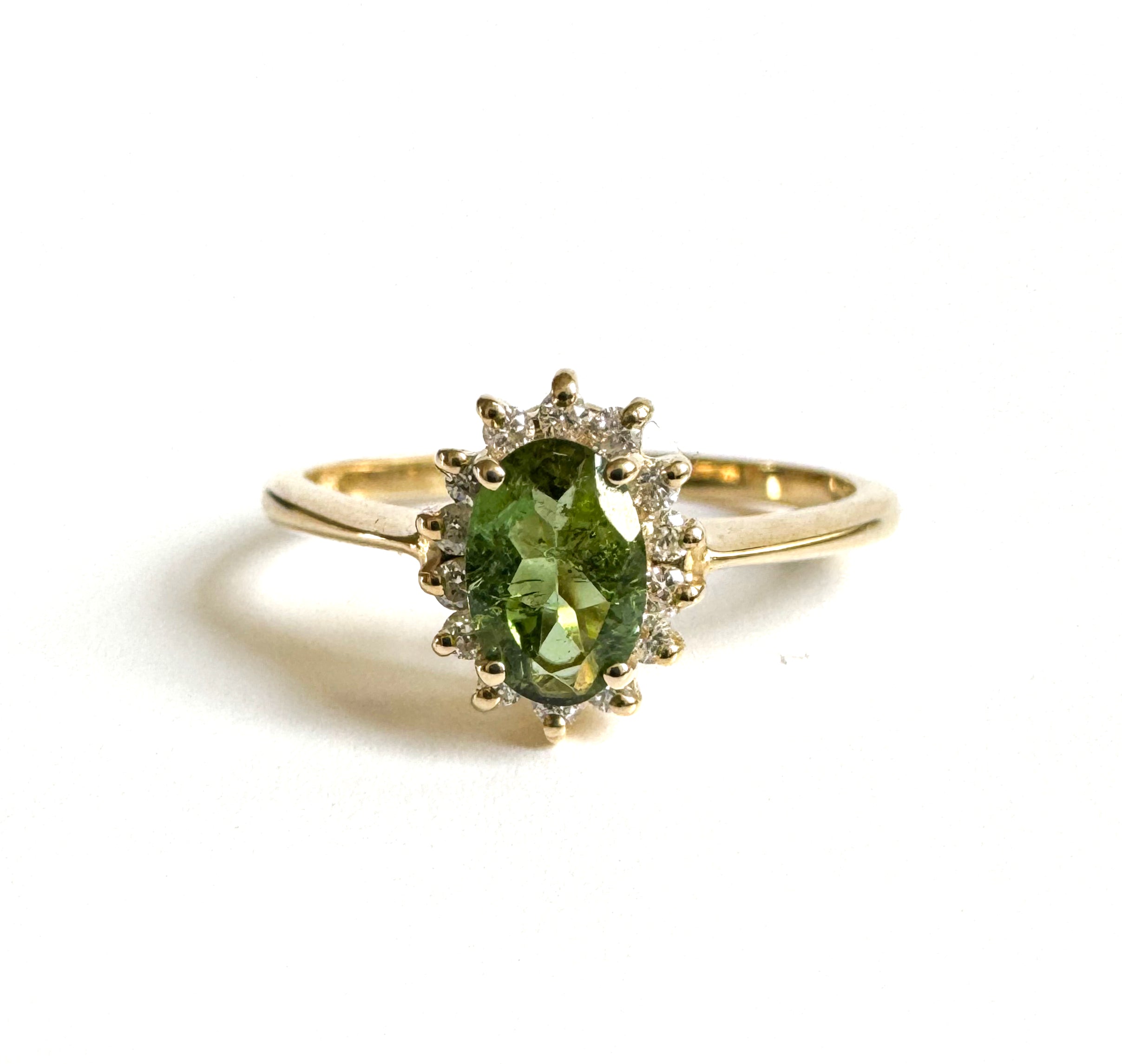 Deze ring genaamd 'Marise' behoort tot onze Exclusieve Dufay collectie. Elk stuk in deze unieke collectie draagt zijn eigen charme en is met liefde en vakmanschap gemaakt. De ring is vervaardigd van 14 karaat geelgoud met in het midden een heldergroene toermalijn, omringd door schitterende diamanten.