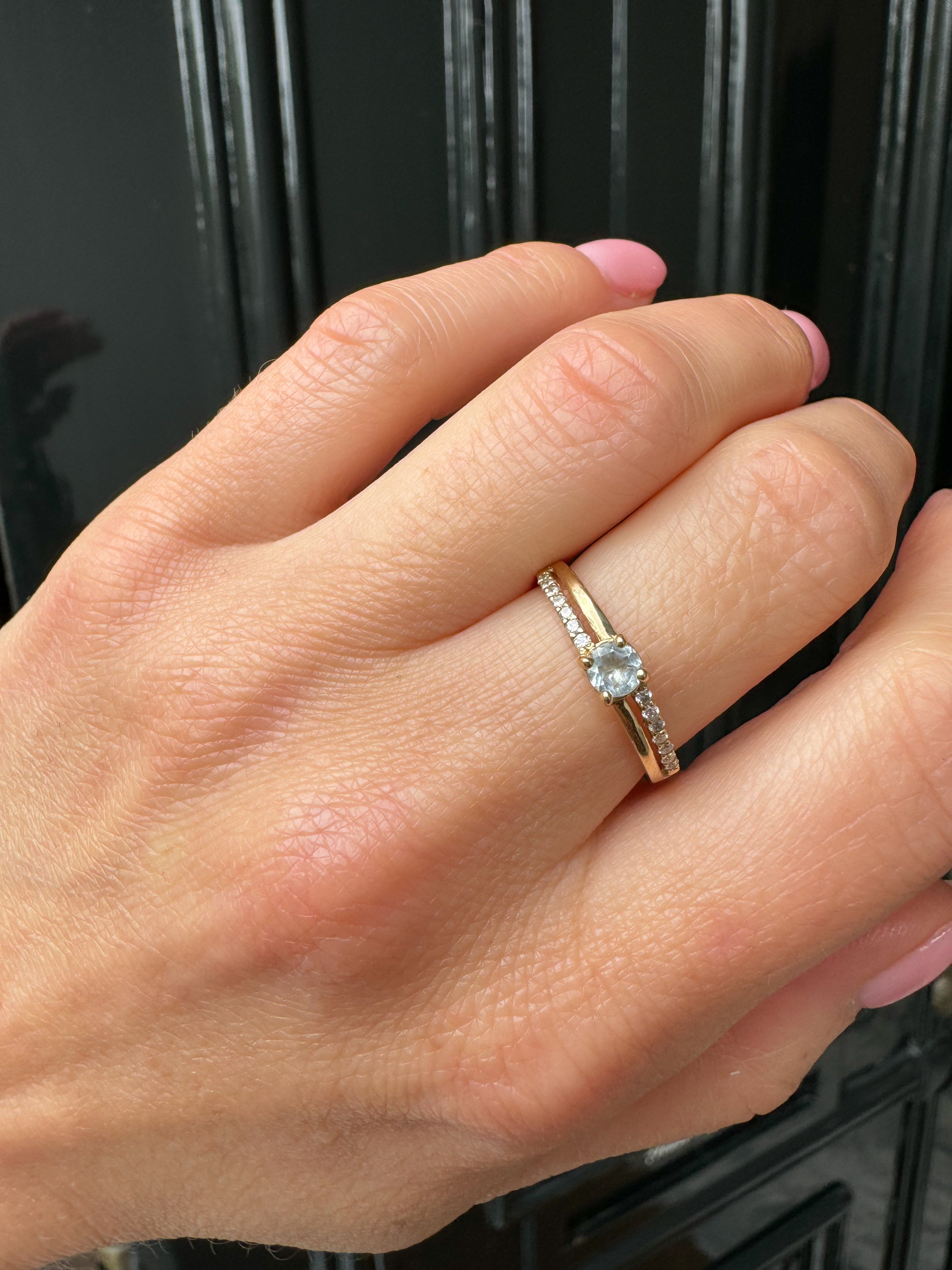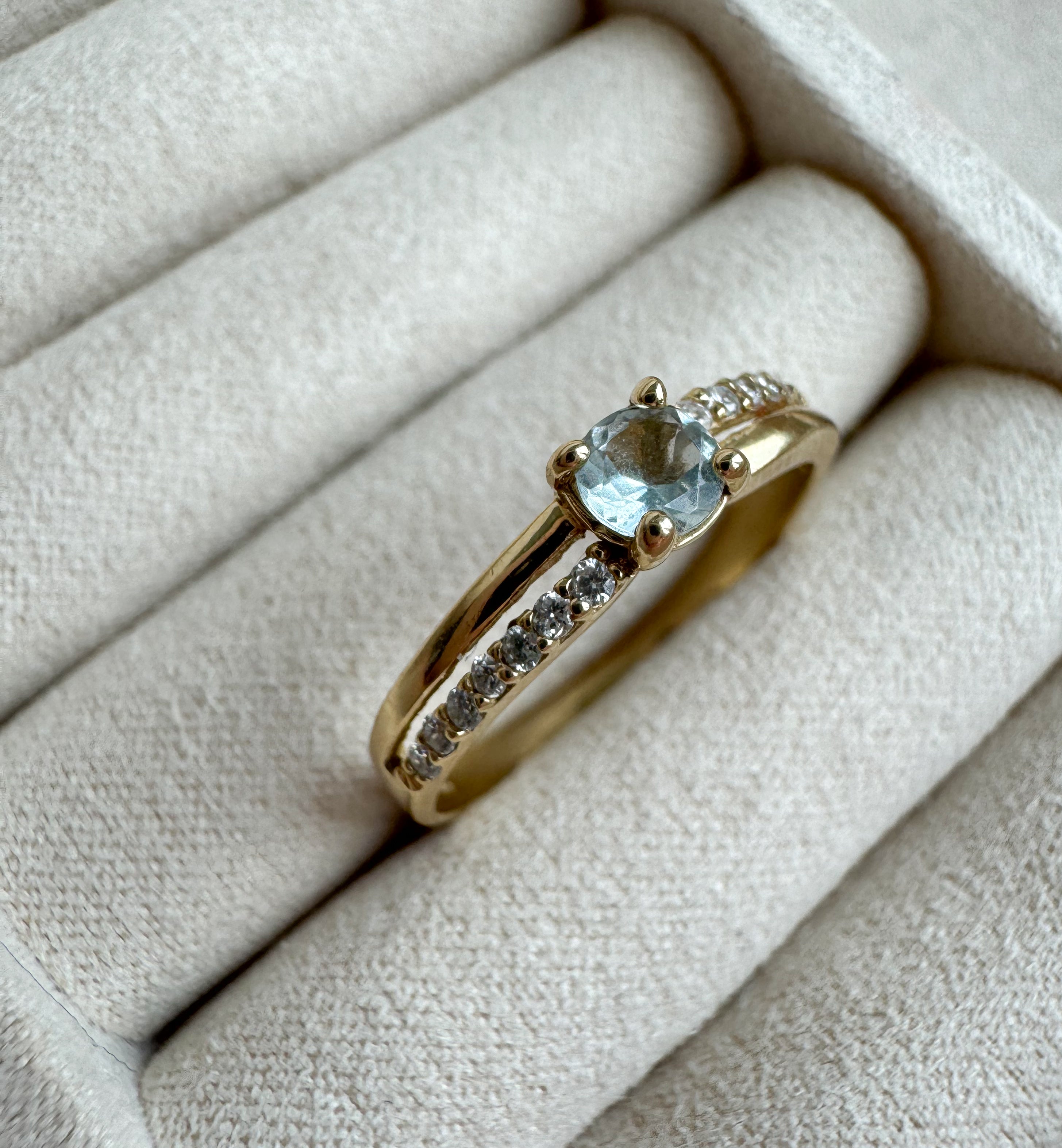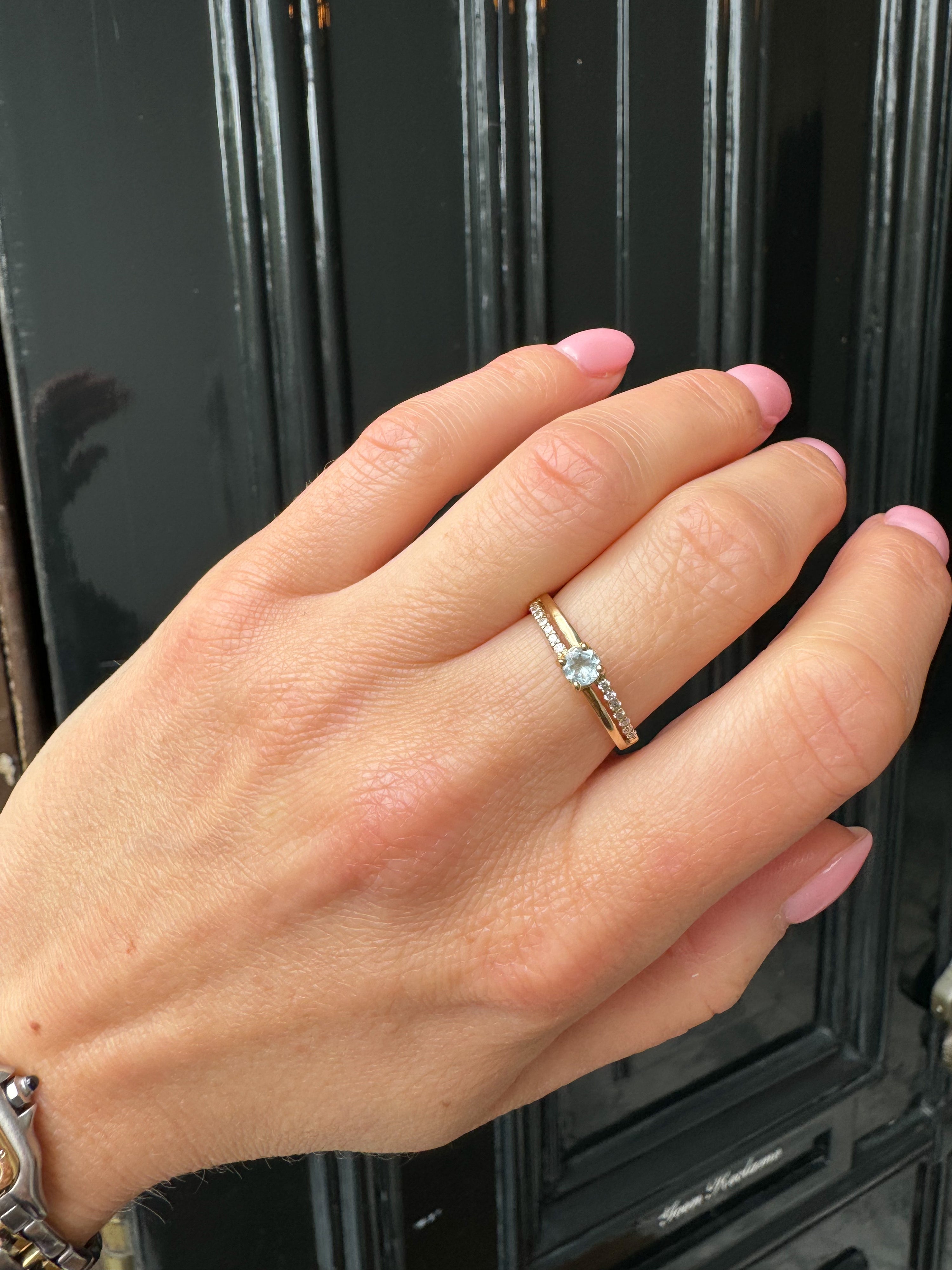 Deze ring genaamd 'Paulina' behoort tot onze Exclusieve Dufay collectie. Elk stuk in deze unieke collectie draagt haar eigen charme en is met liefde en vakmanschap gemaakt. De ring is gemaakt van 14 karaat geelgoud met in het midden een betoverende lichtblauwe aquamarijn. Verder heeft de ring een sierlijke band met daarin diamantjes gezet.