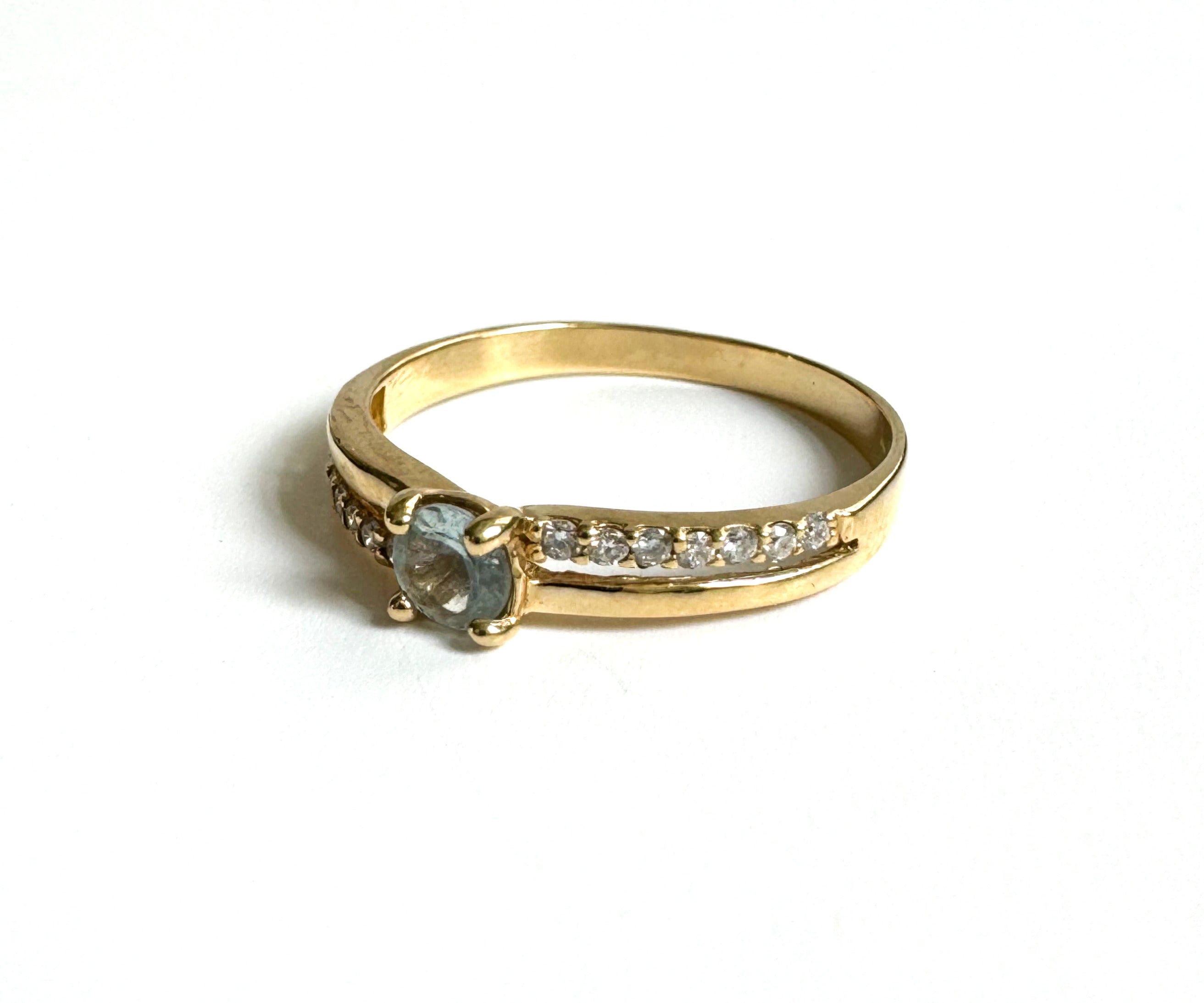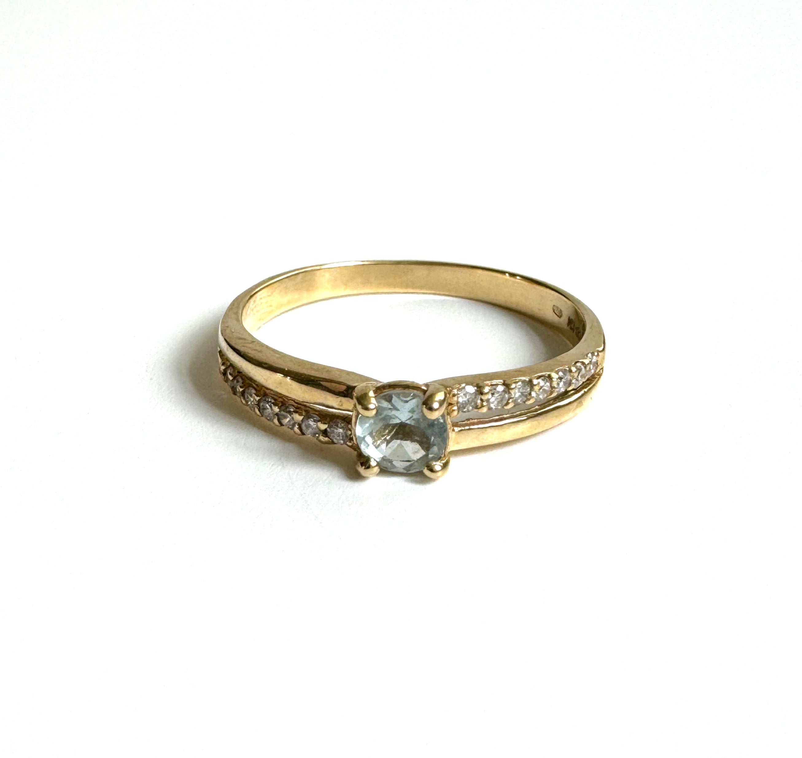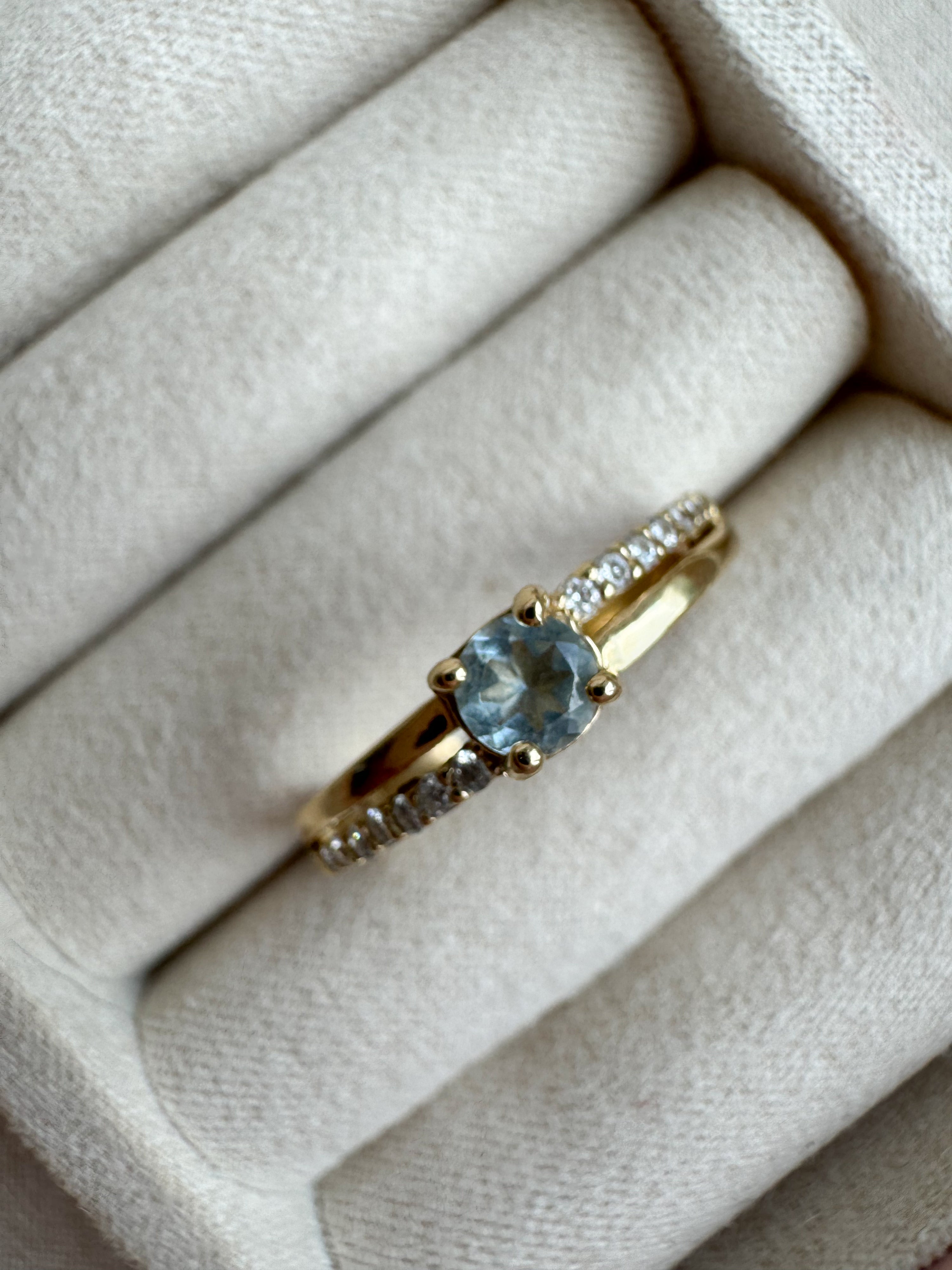 Deze ring genaamd 'Paulina' behoort tot onze Exclusieve Dufay collectie. Elk stuk in deze unieke collectie draagt haar eigen charme en is met liefde en vakmanschap gemaakt. De ring is gemaakt van 14 karaat geelgoud met in het midden een betoverende lichtblauwe aquamarijn. Verder heeft de ring een sierlijke band met daarin diamantjes gezet.