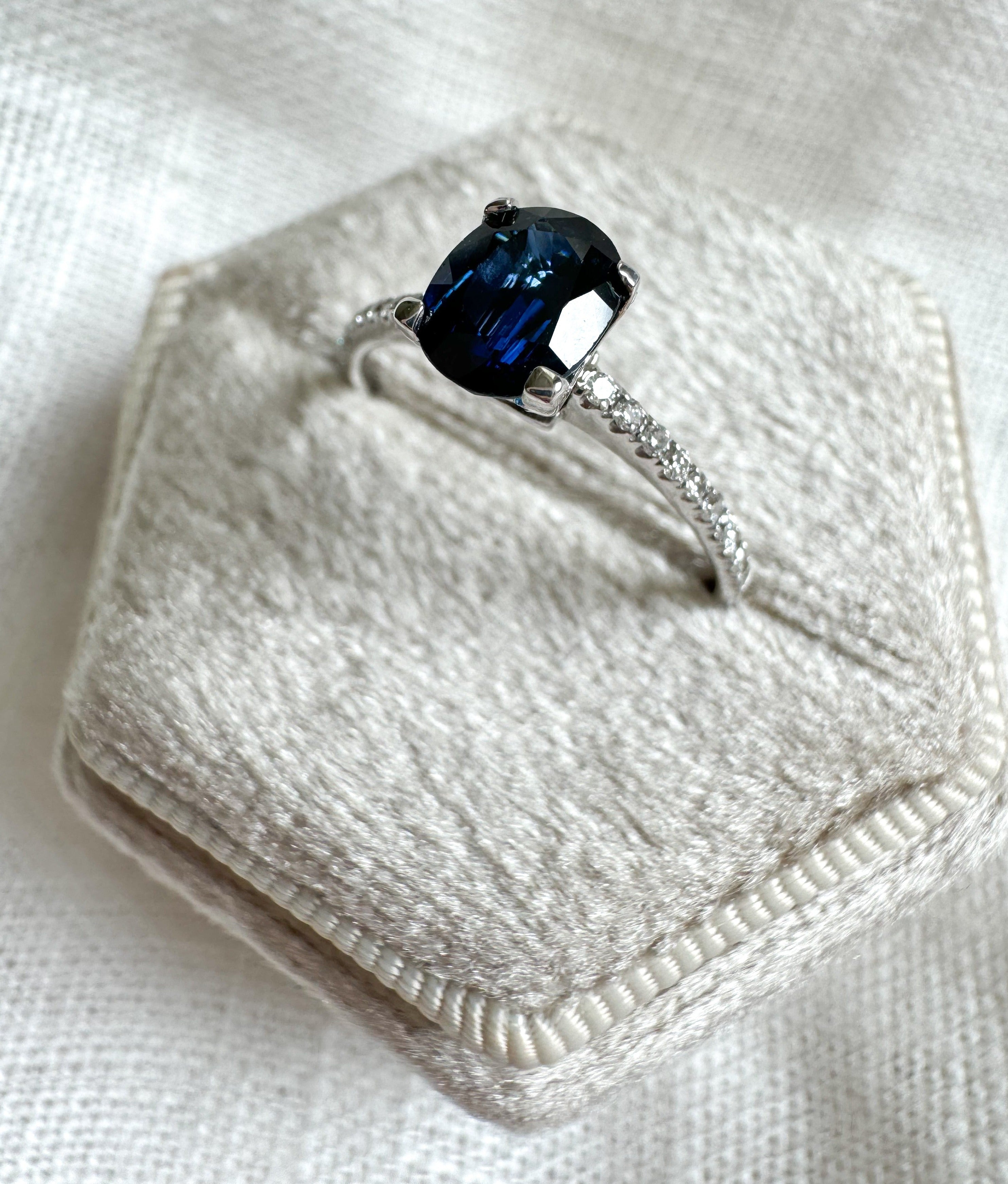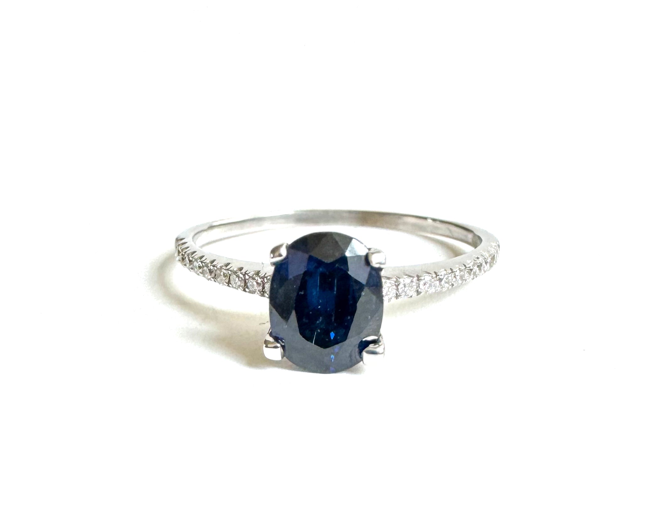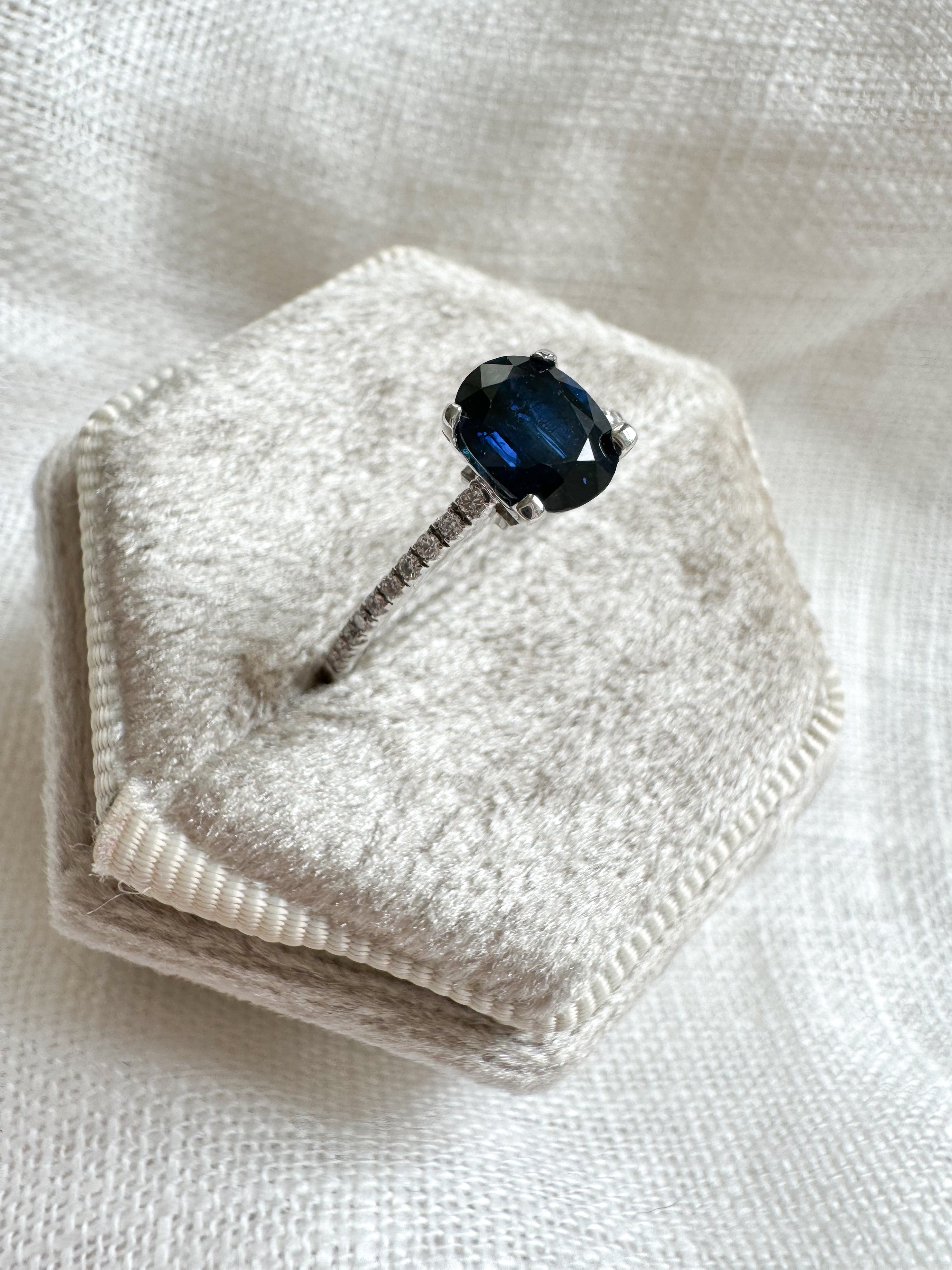 Deze exclusieve vintage saffier/diamant ring 'Robien' is een klassiek juweel. De ring is gemaakt van 18 karaat wit goud met in het midden een prachtige ovaal geslepen saffier en 20 stuks briljant geslepen diamanten. Deze klassieke ring heeft een elegante zetting met prachtige details en is perfect voor iedere bijzondere gelegenheid en als je het ons vraagt de perfecte verloving/trouwring. Het is een uniek en tijdloos stuk dat een prachtige aanvulling zou zijn op elke juwelencollectie.