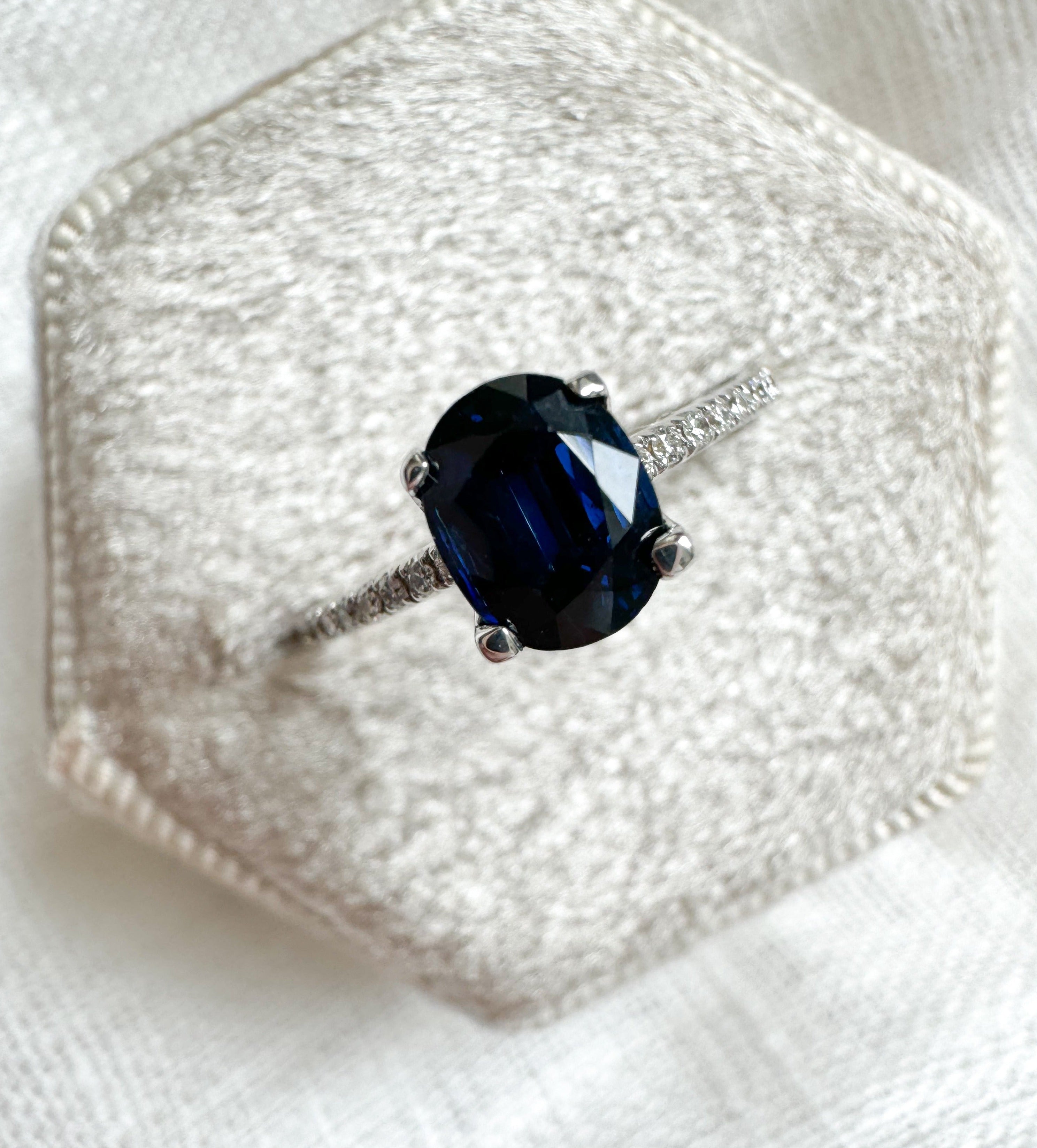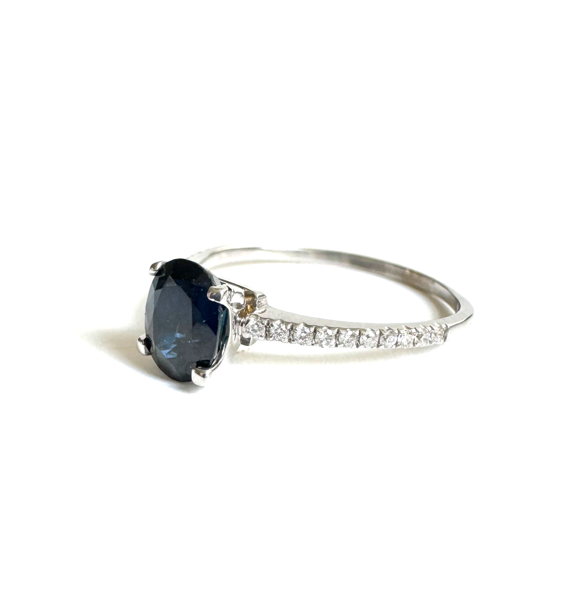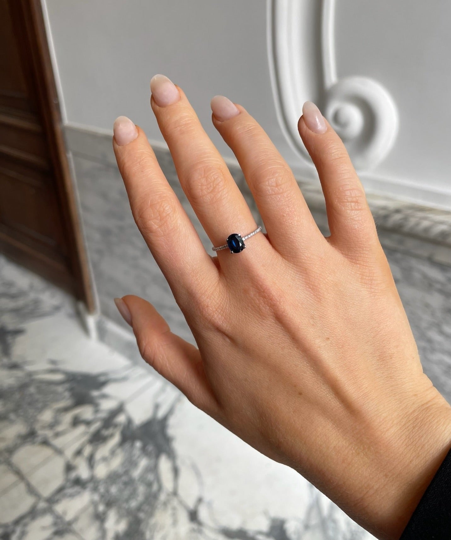 Deze exclusieve vintage saffier/diamant ring 'Robien' is een klassiek juweel. De ring is gemaakt van 18 karaat wit goud met in het midden een prachtige ovaal geslepen saffier en 20 stuks briljant geslepen diamanten. Deze klassieke ring heeft een elegante zetting met prachtige details en is perfect voor iedere bijzondere gelegenheid en als je het ons vraagt de perfecte verloving/trouwring. Het is een uniek en tijdloos stuk dat een prachtige aanvulling zou zijn op elke juwelencollectie.