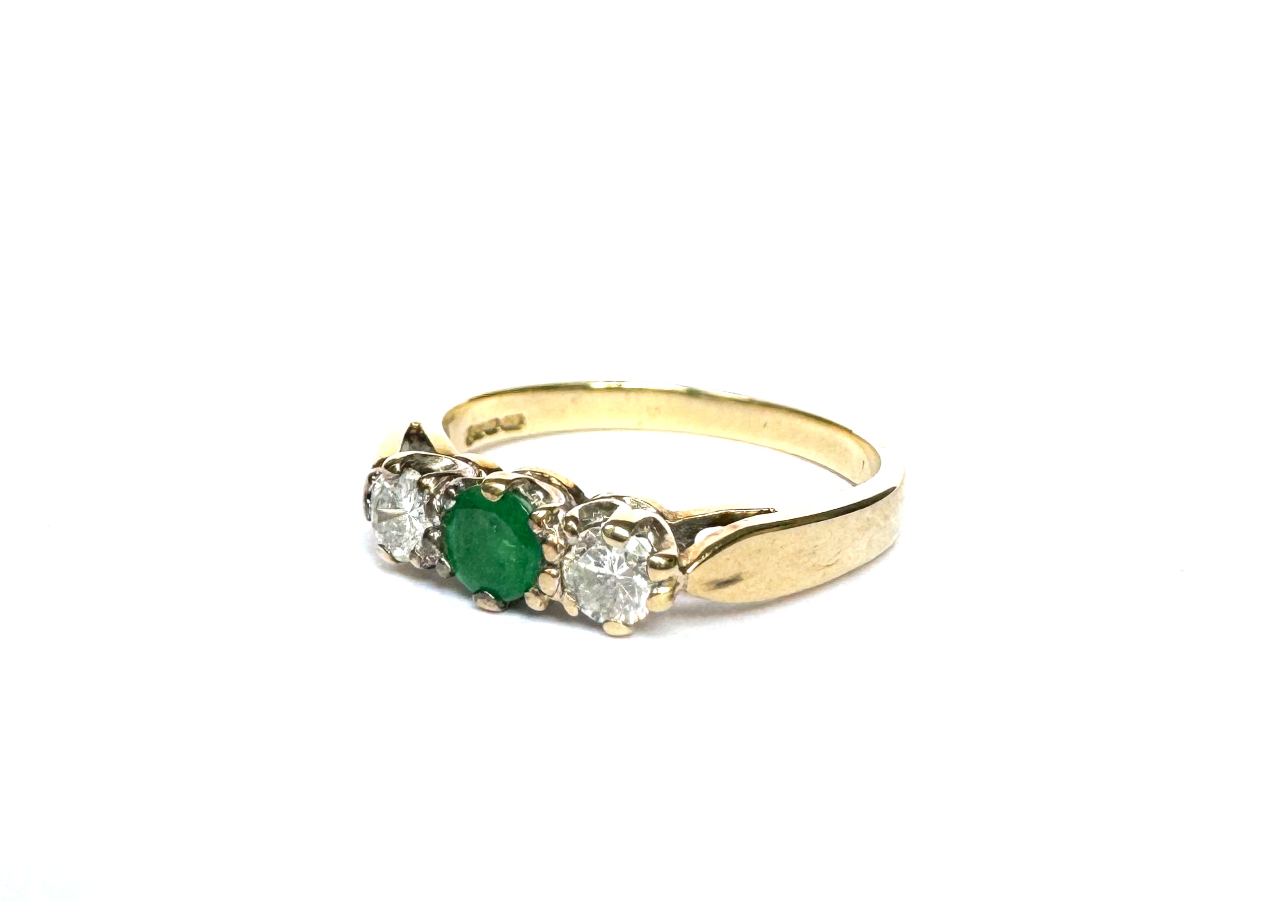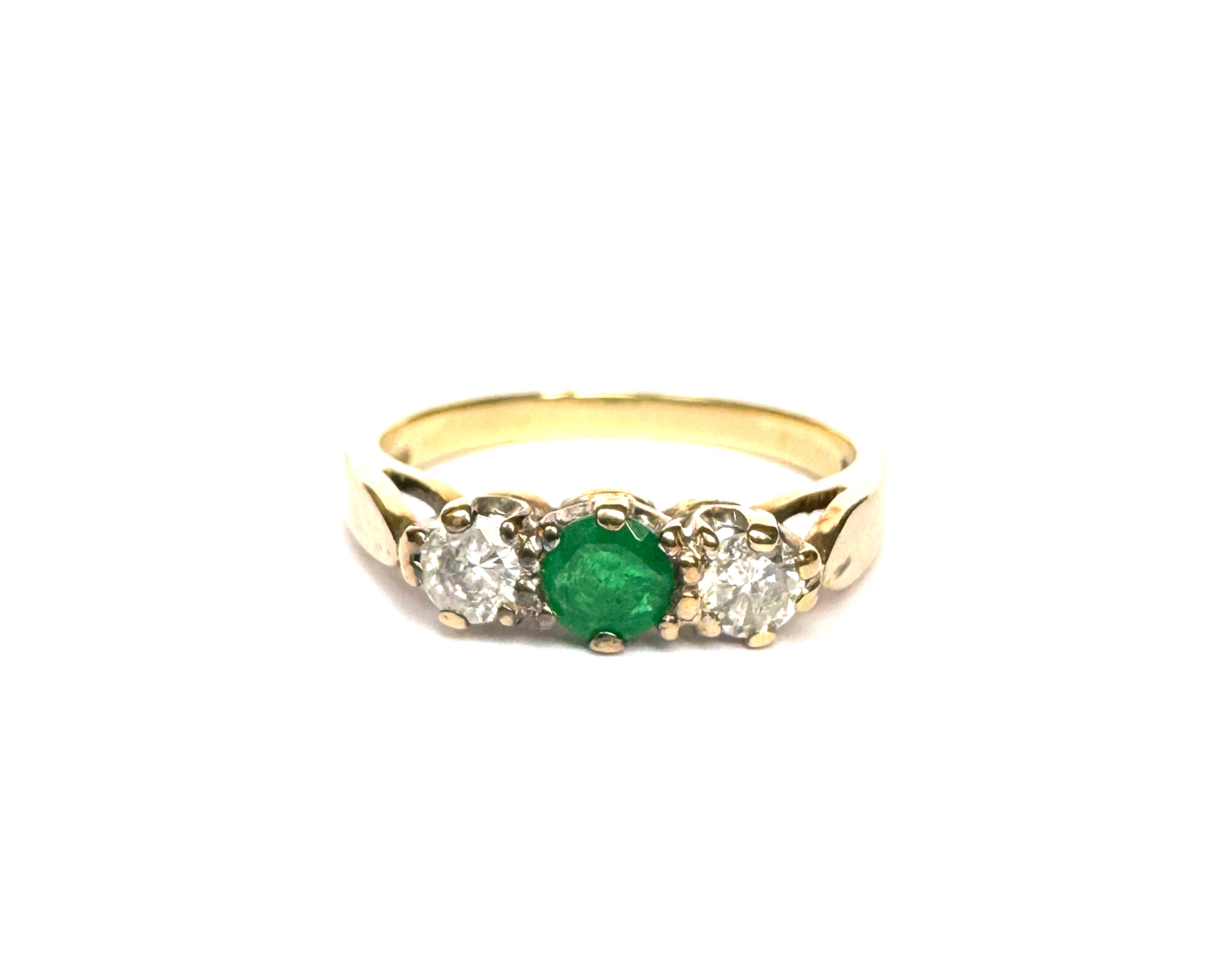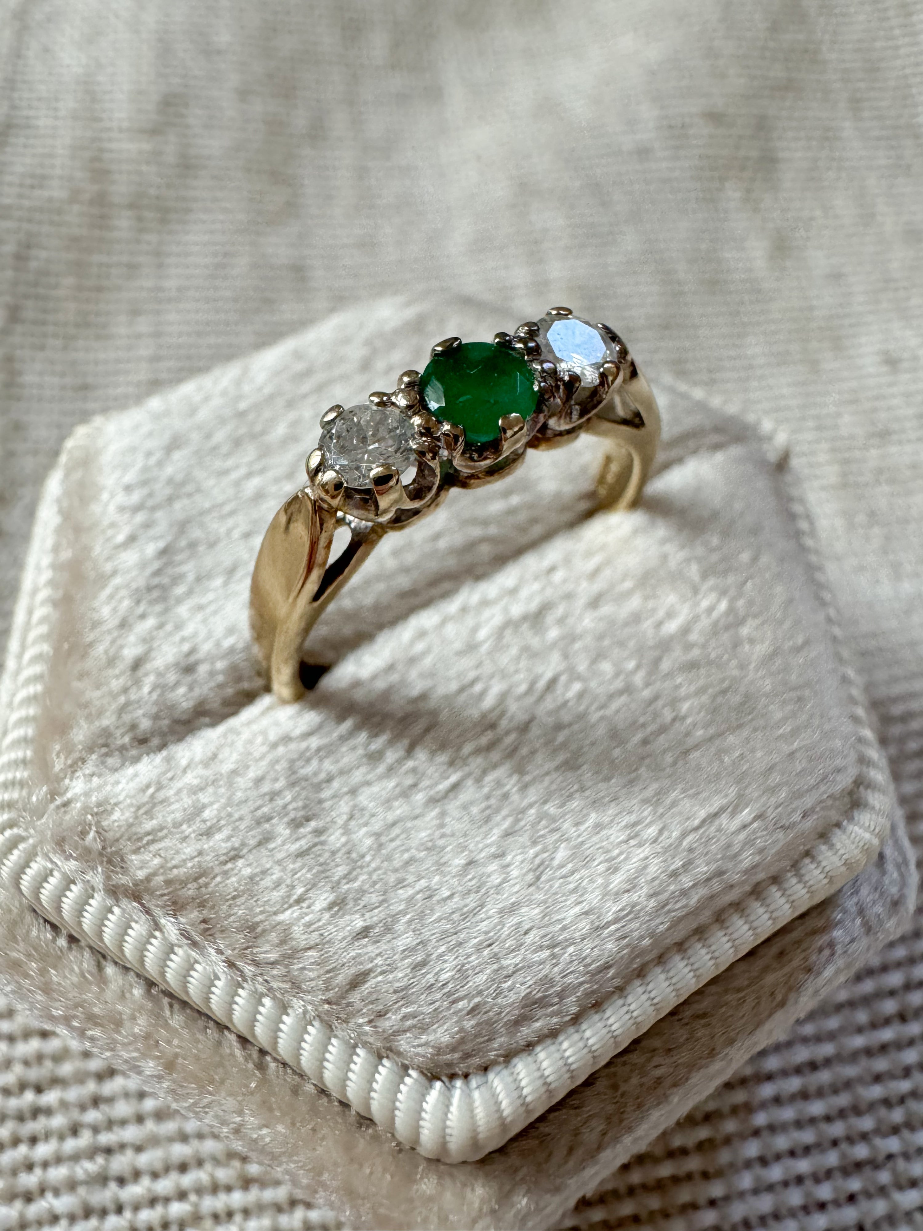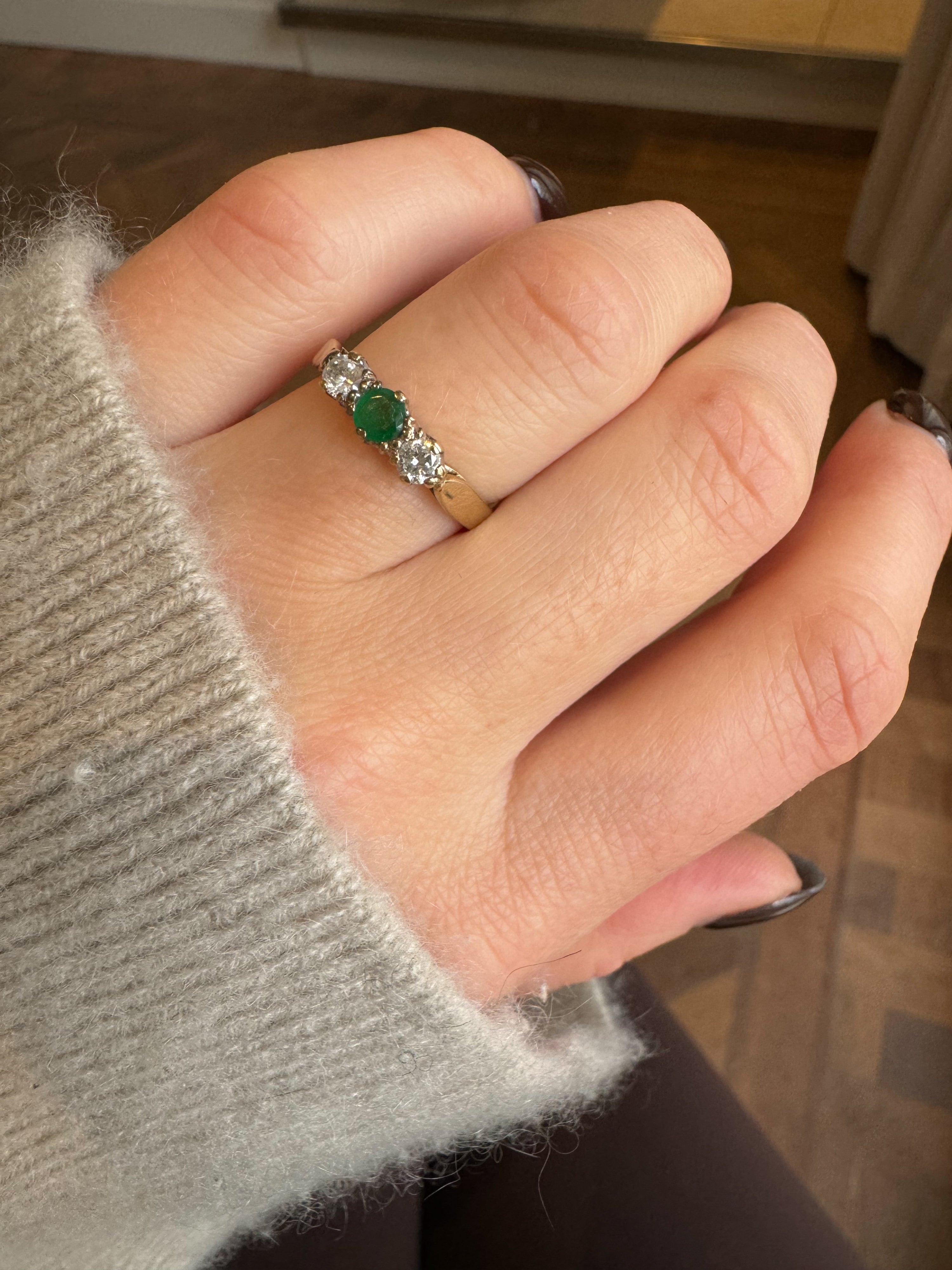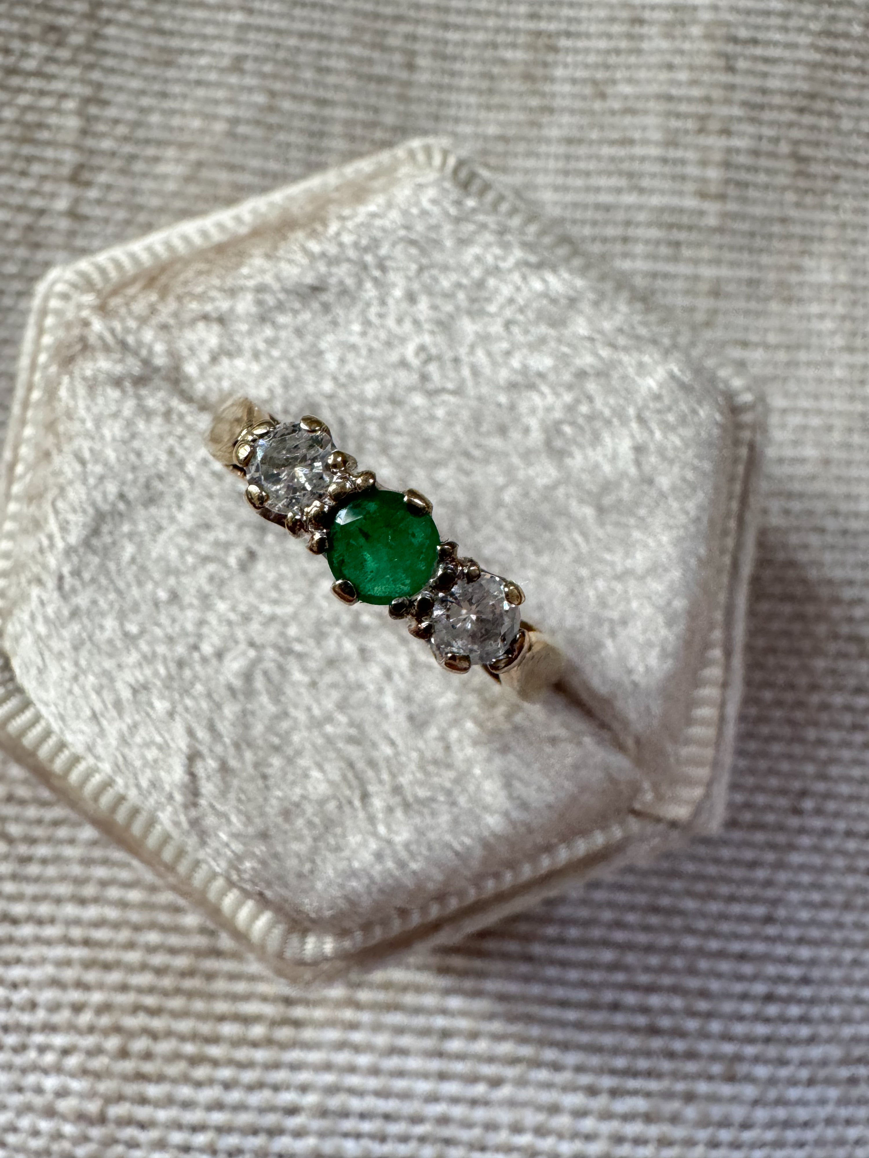 De vintage smaragd & diamant ring 'Robien' is een prachtig juweel. Deze ring is gemaakt van 9 karaat geel goud en heeft in het midden een heldergroene smaragd steen met daarnaast aan beiden kanten een schitterende diamant. De ring straalt verfijning en elegantie uit, en de unieke heldergroene kleur van de smaragd geeft haar een klassieke uitstraling.